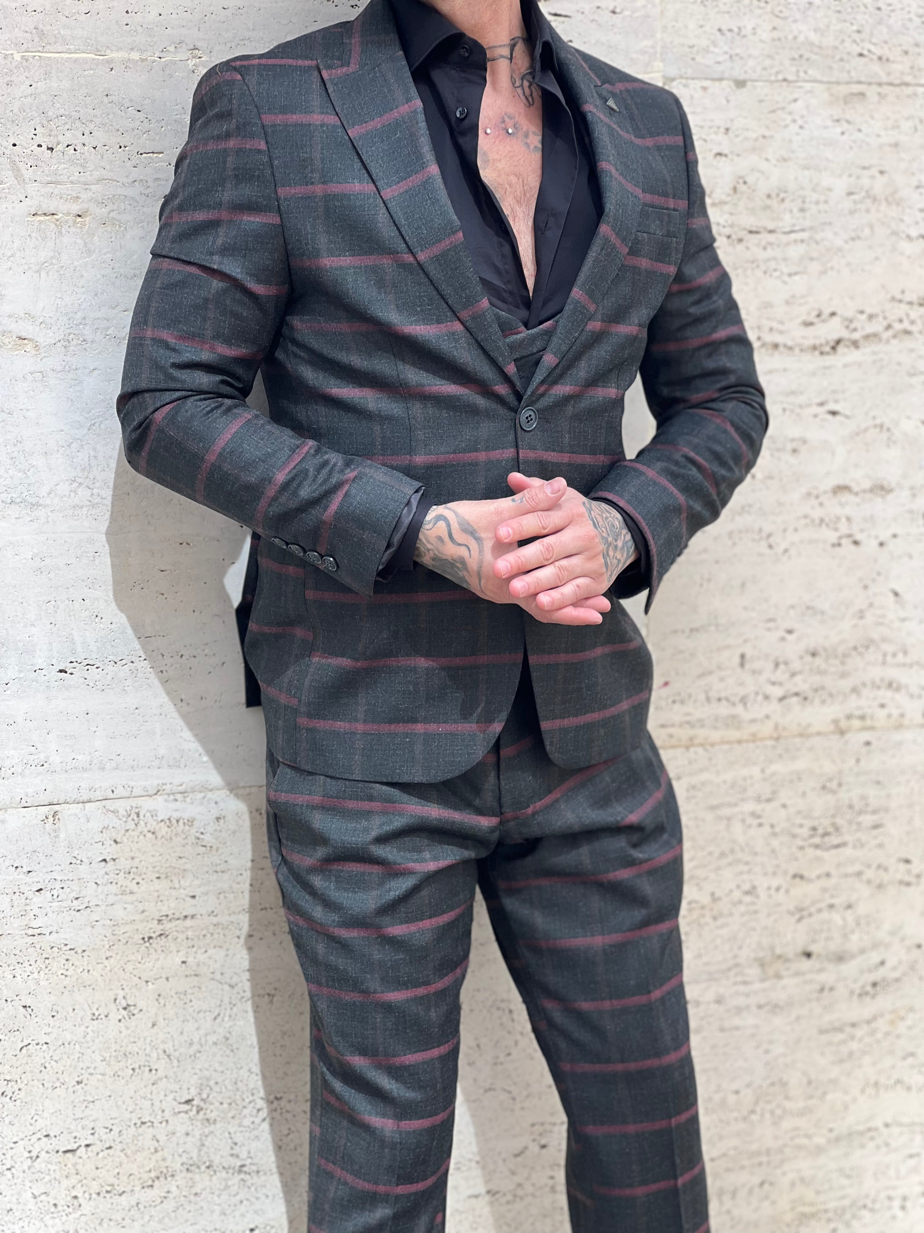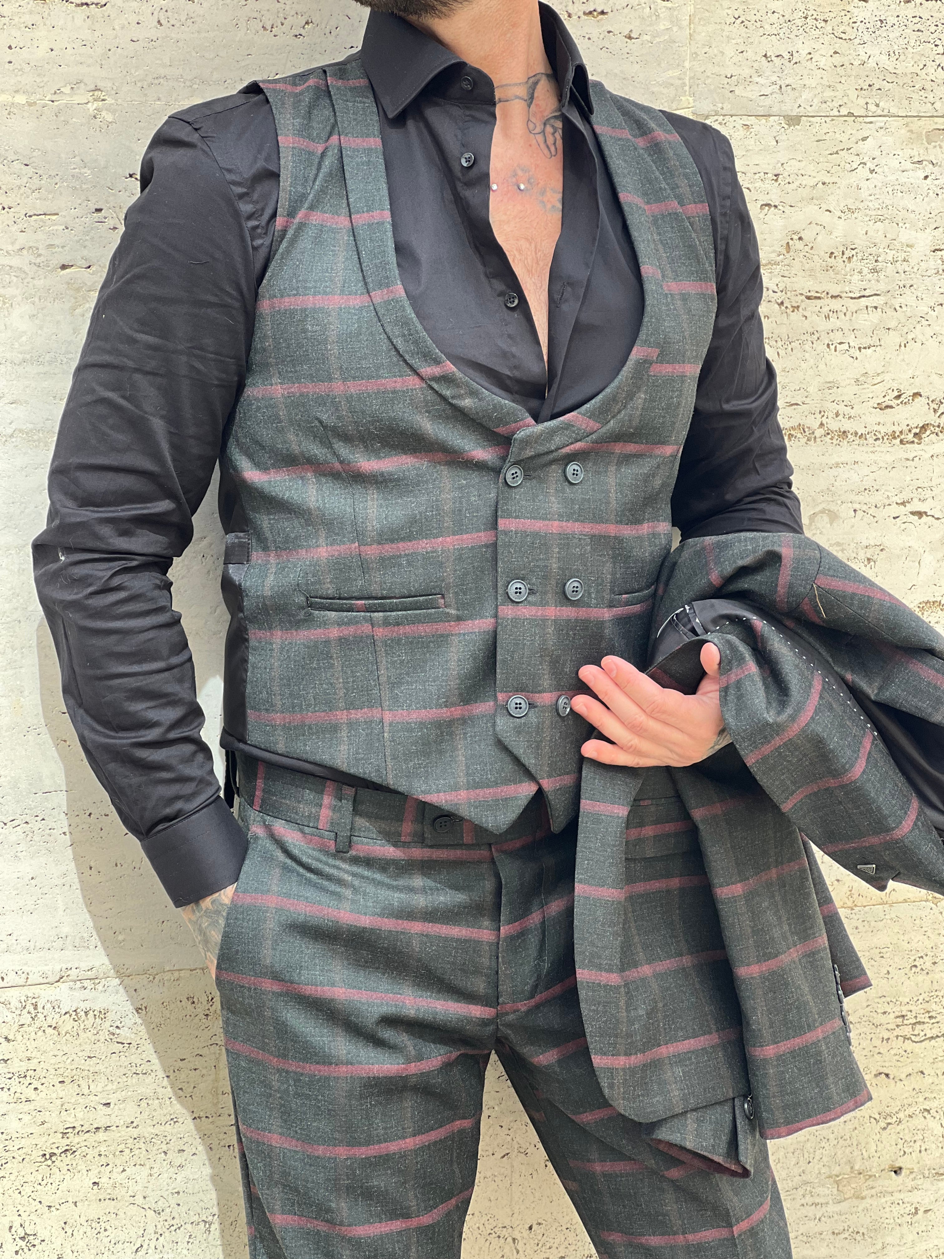 Abito : doppio petto , Vestibilita ‘ poco Slim , colore grigio/bordo’ , Gile ‘ doppio petto