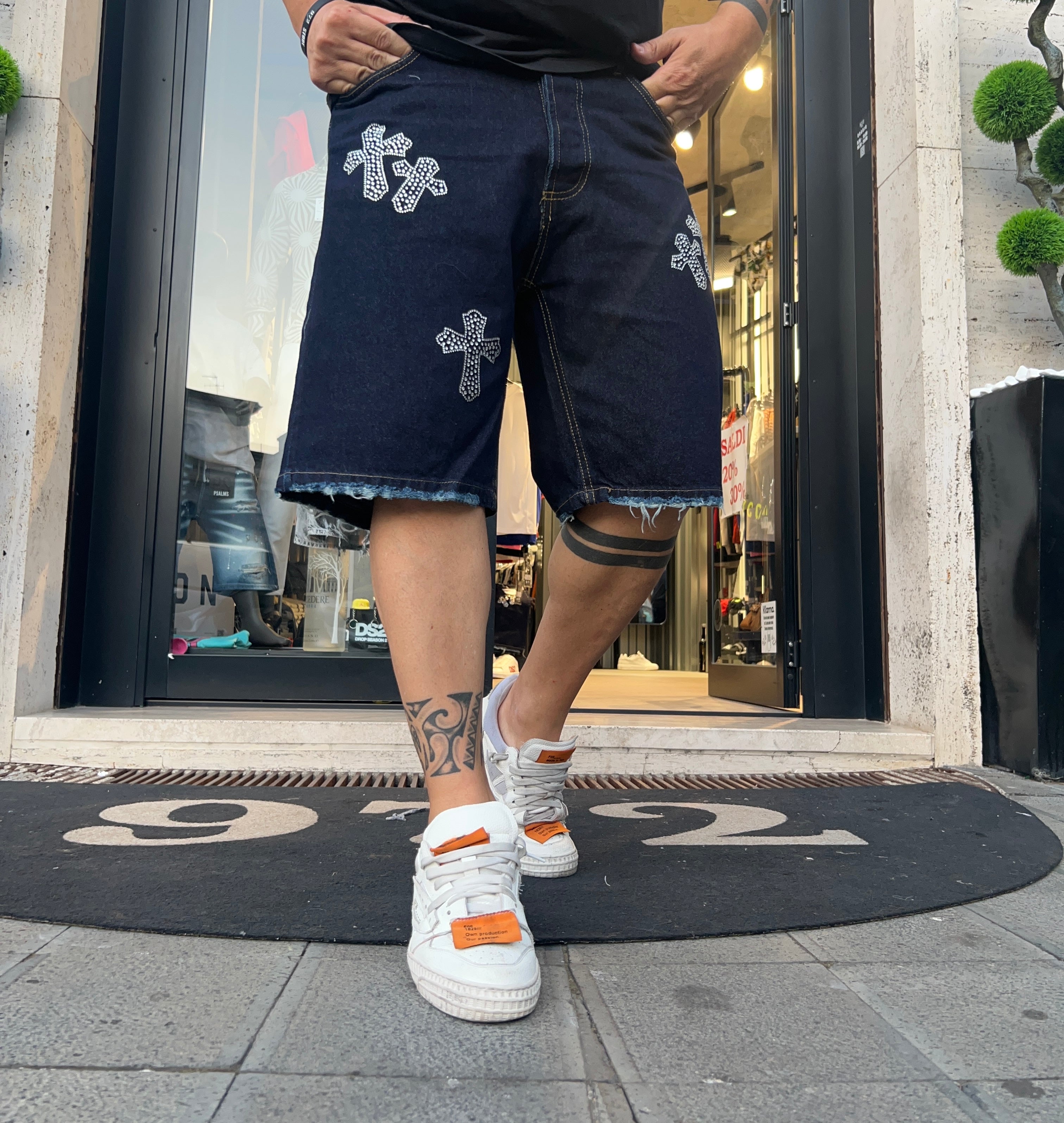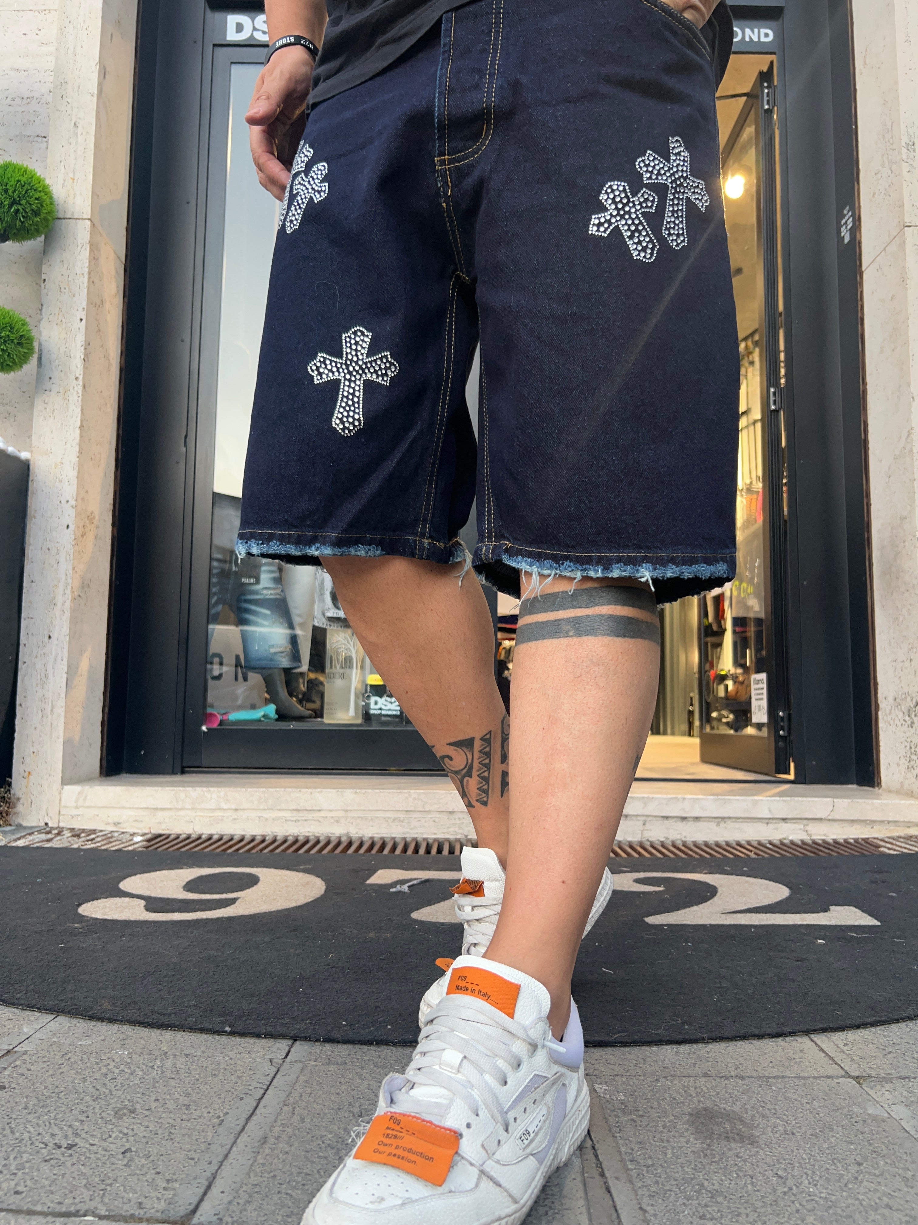 Jeans : colore blu scuro , con croci brillantinati , Vestibilita ‘ normale