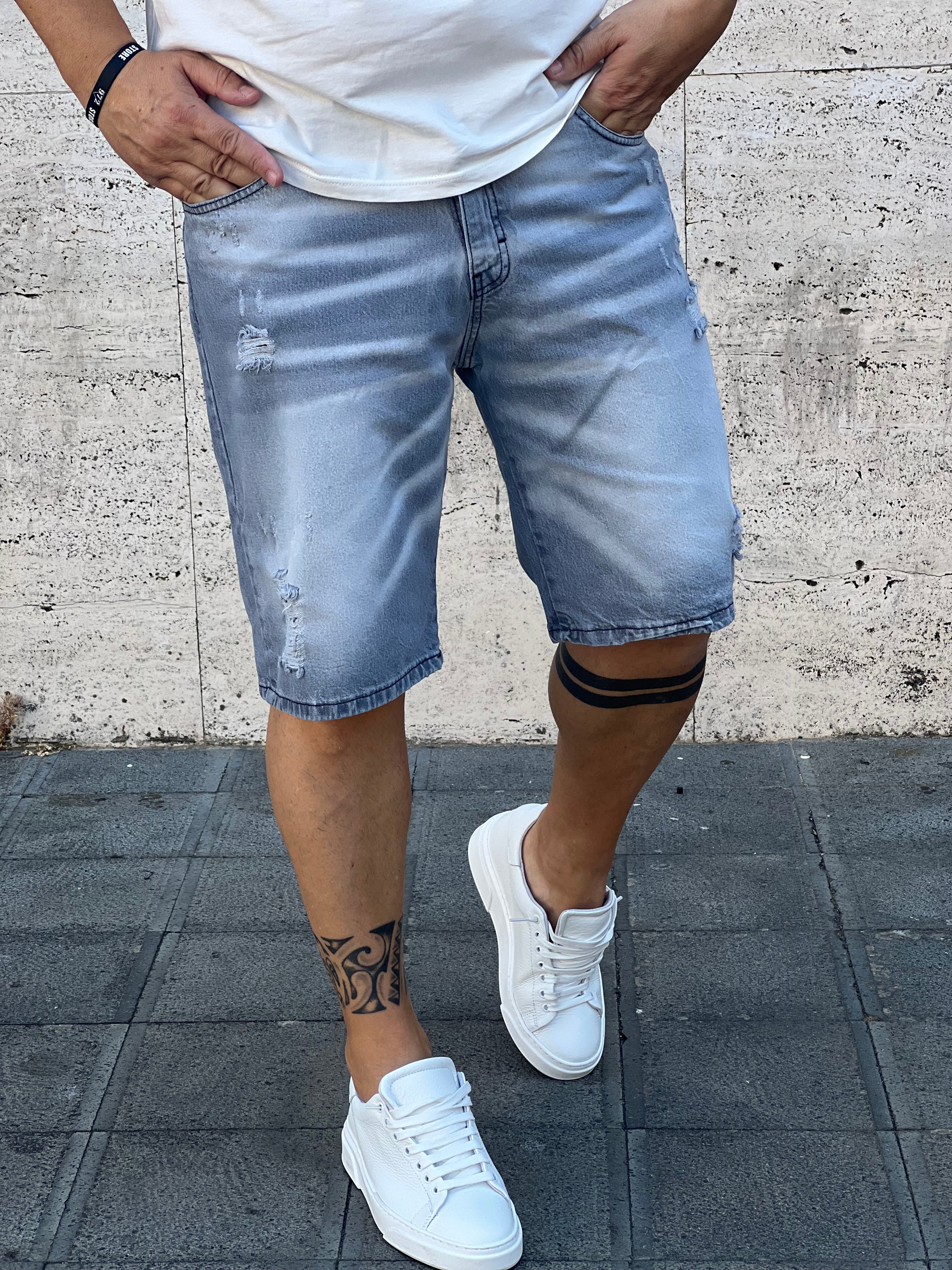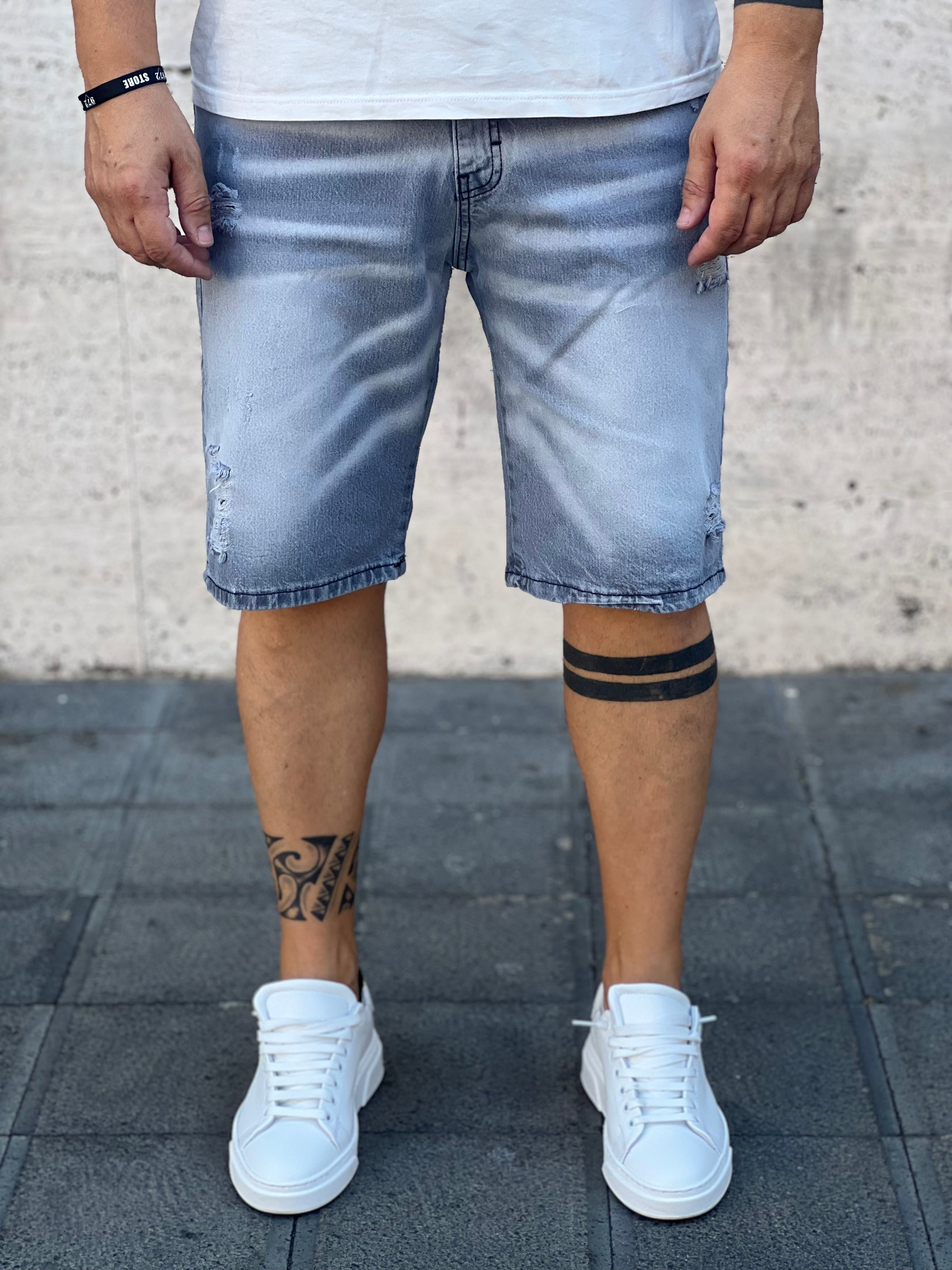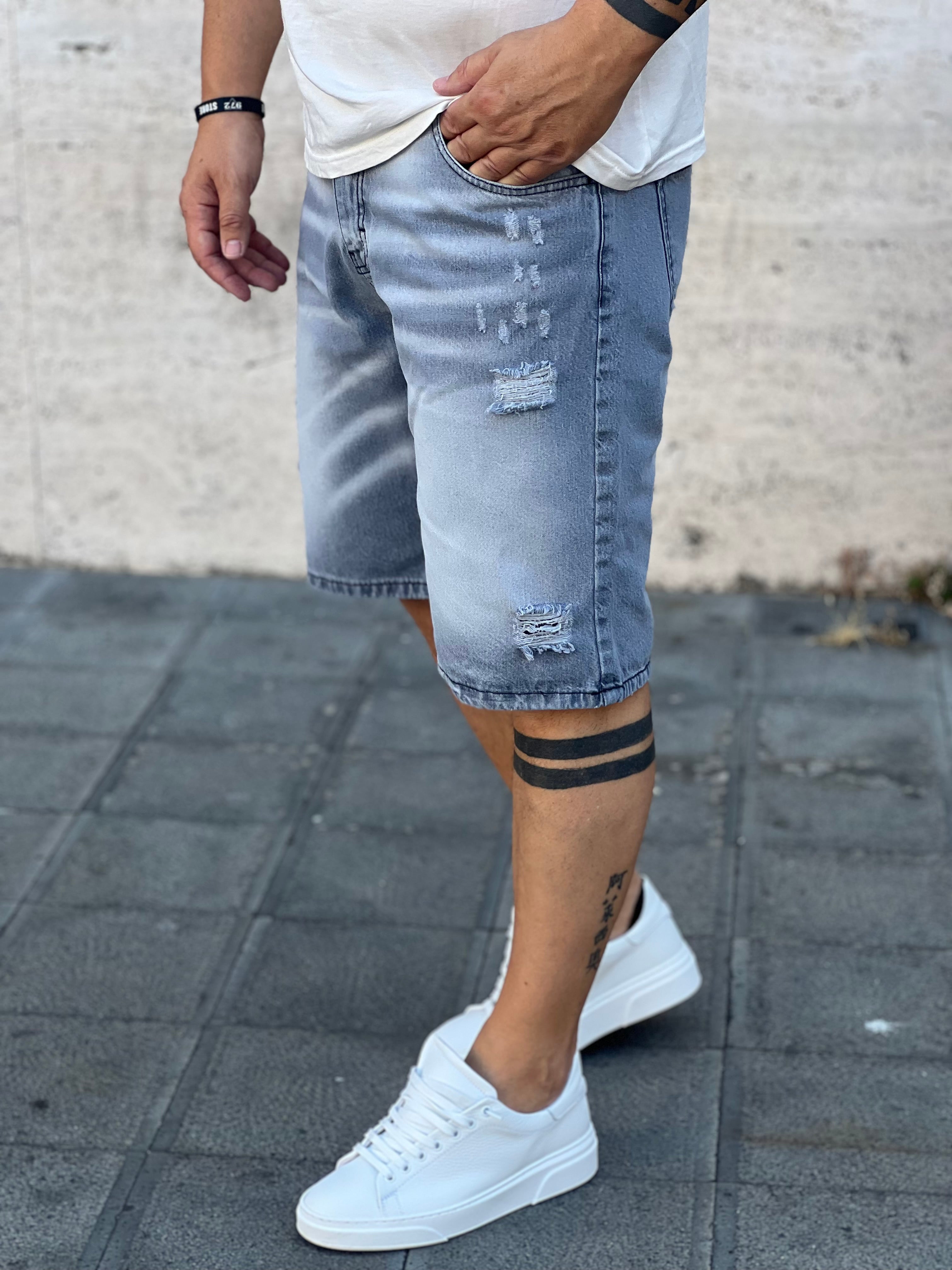 Bermuda in jeans , strappi , colore grigio scuro sfumato , bottone in vita , Vestibilita ‘ normale ,