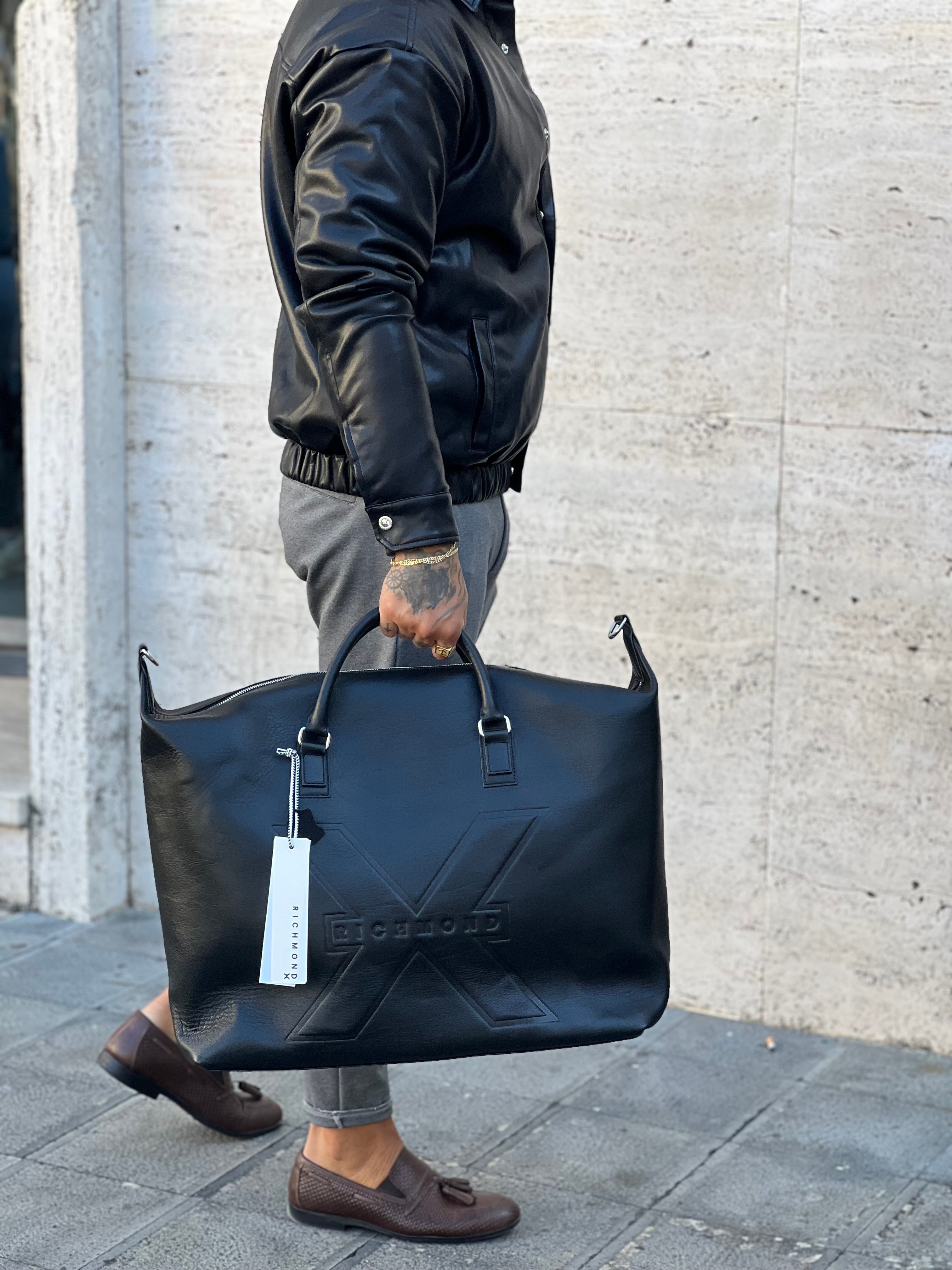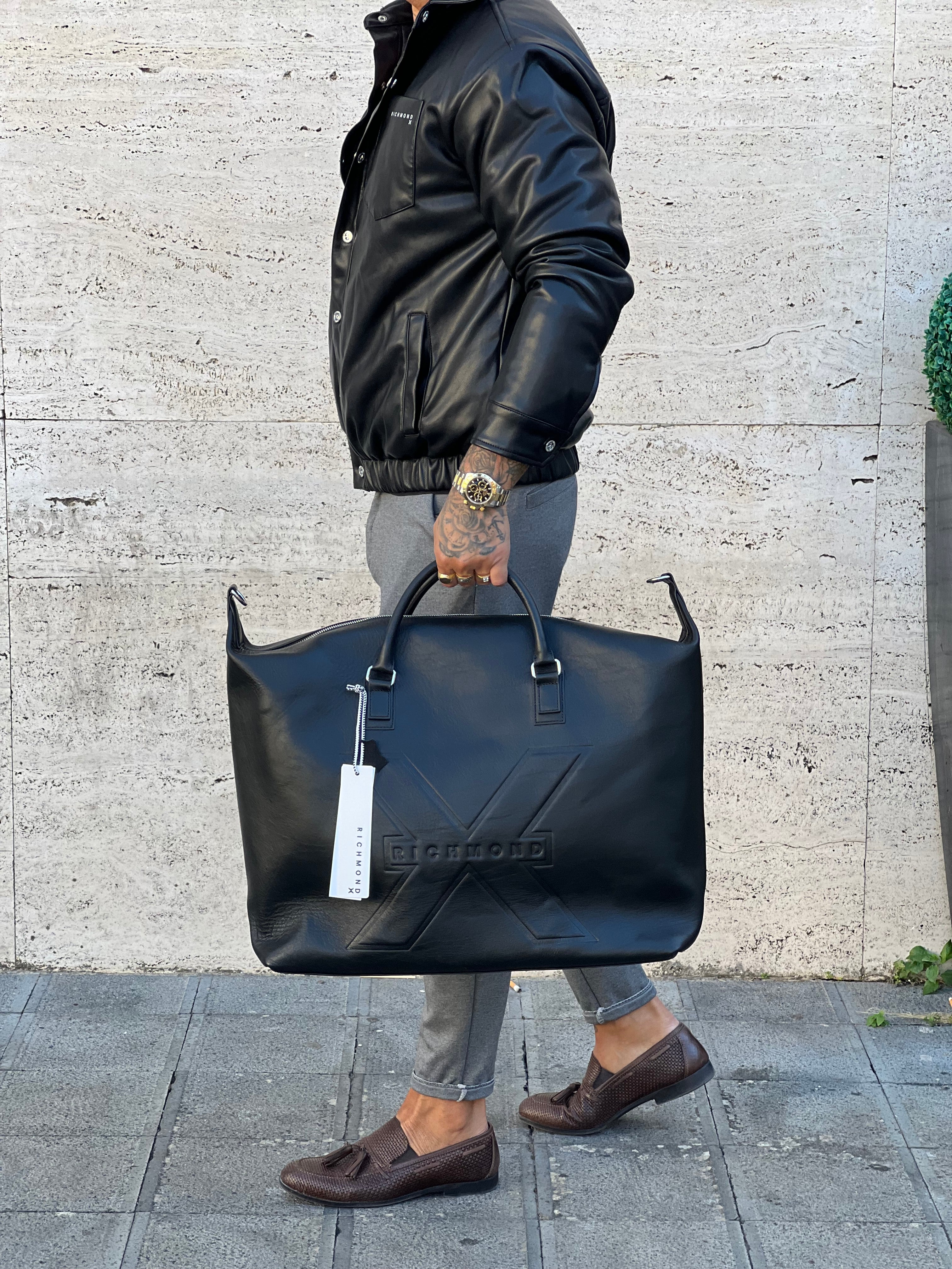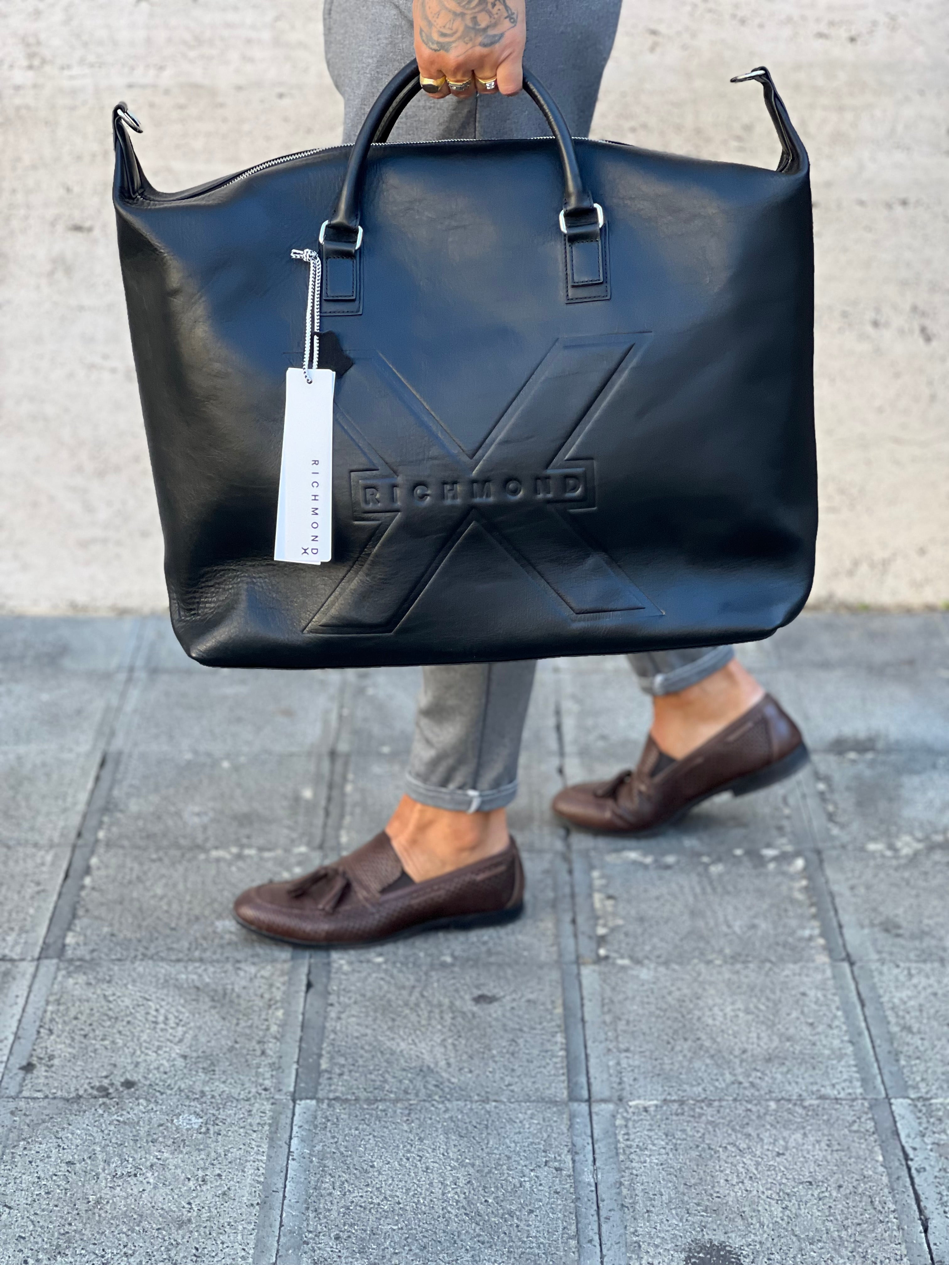 Borsone : vera pelle , elegante , scritta in ricamo rialzato , dimensione media , ideale per viaggi e tempo libero , misura 50x 40