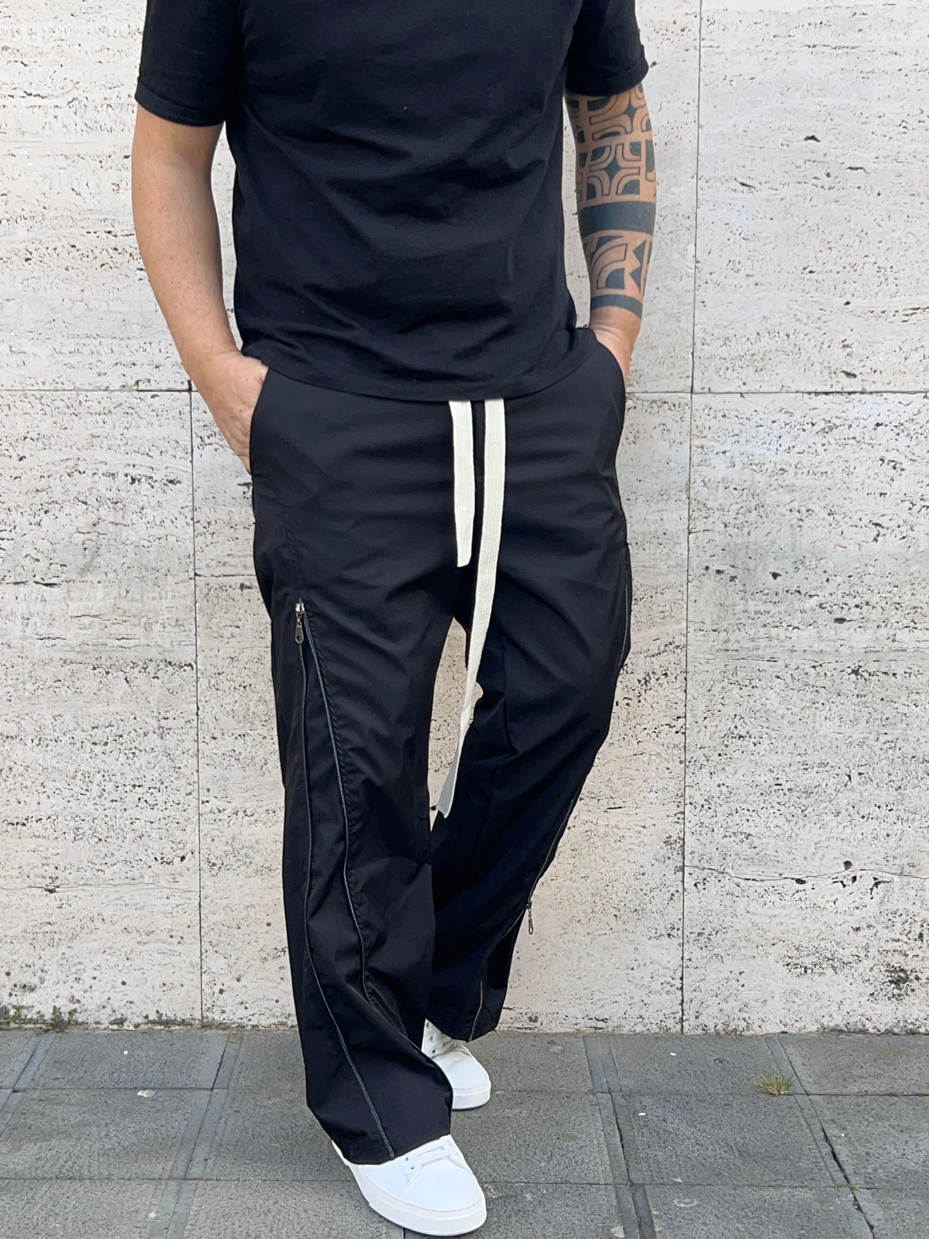 Cargo , colore nero , con cerniere alla gamba , modello Baggy , molla in vita regolabile