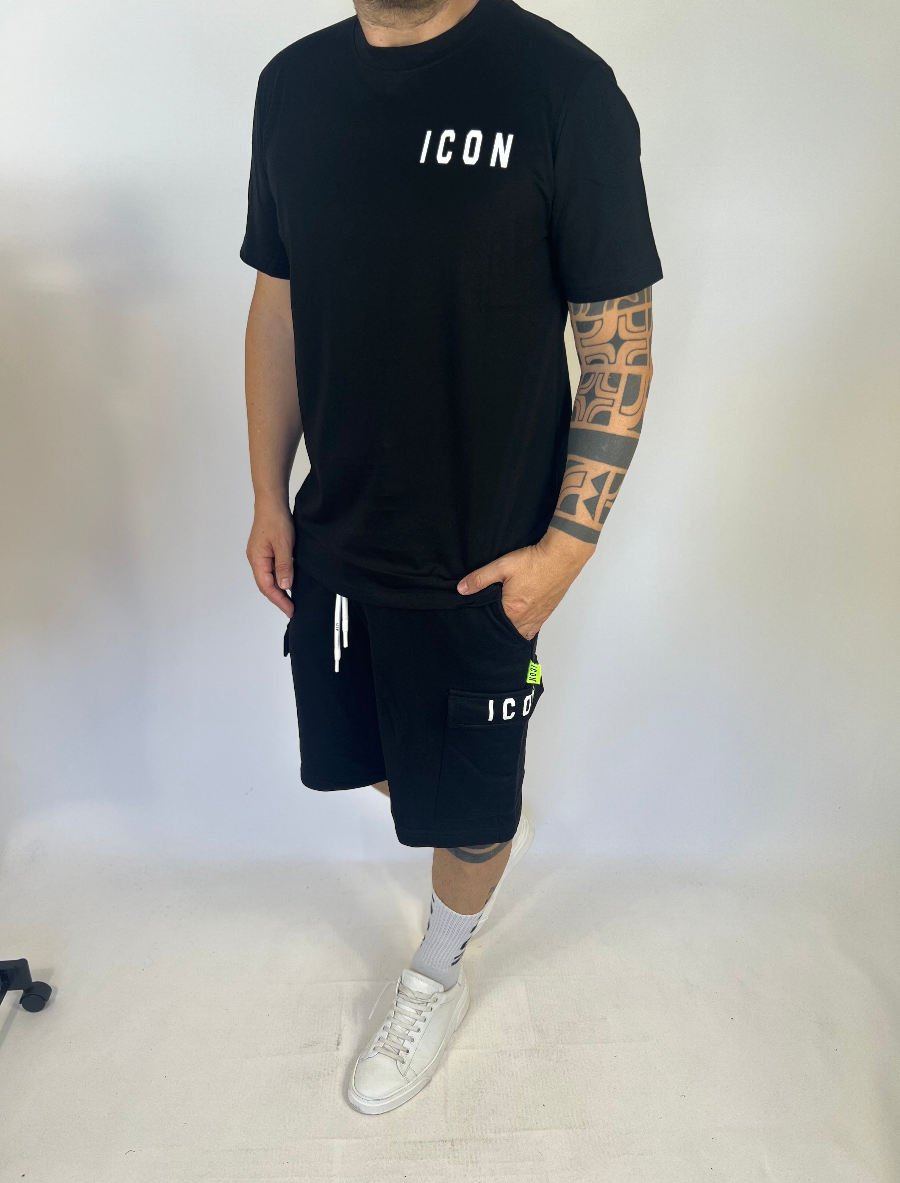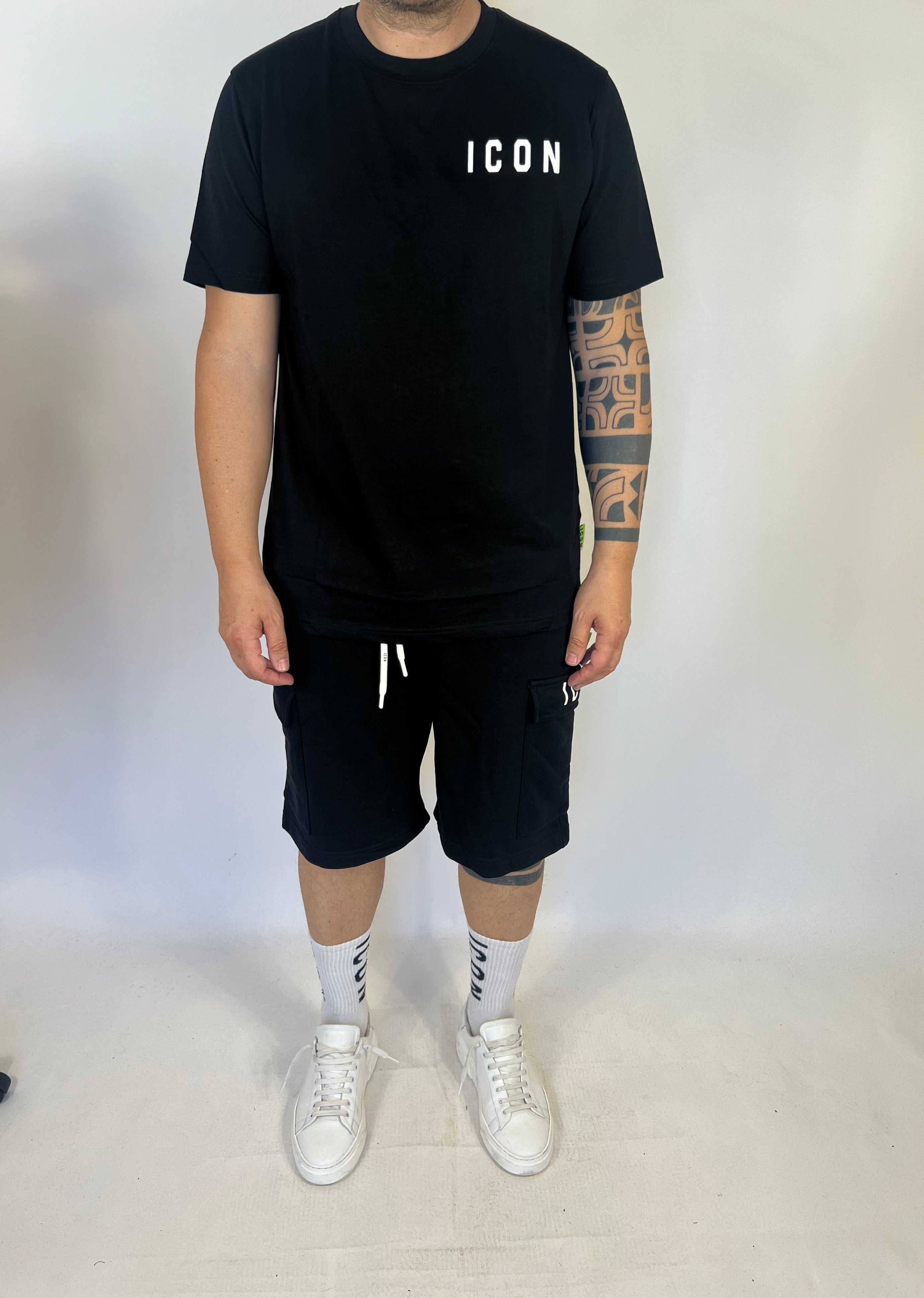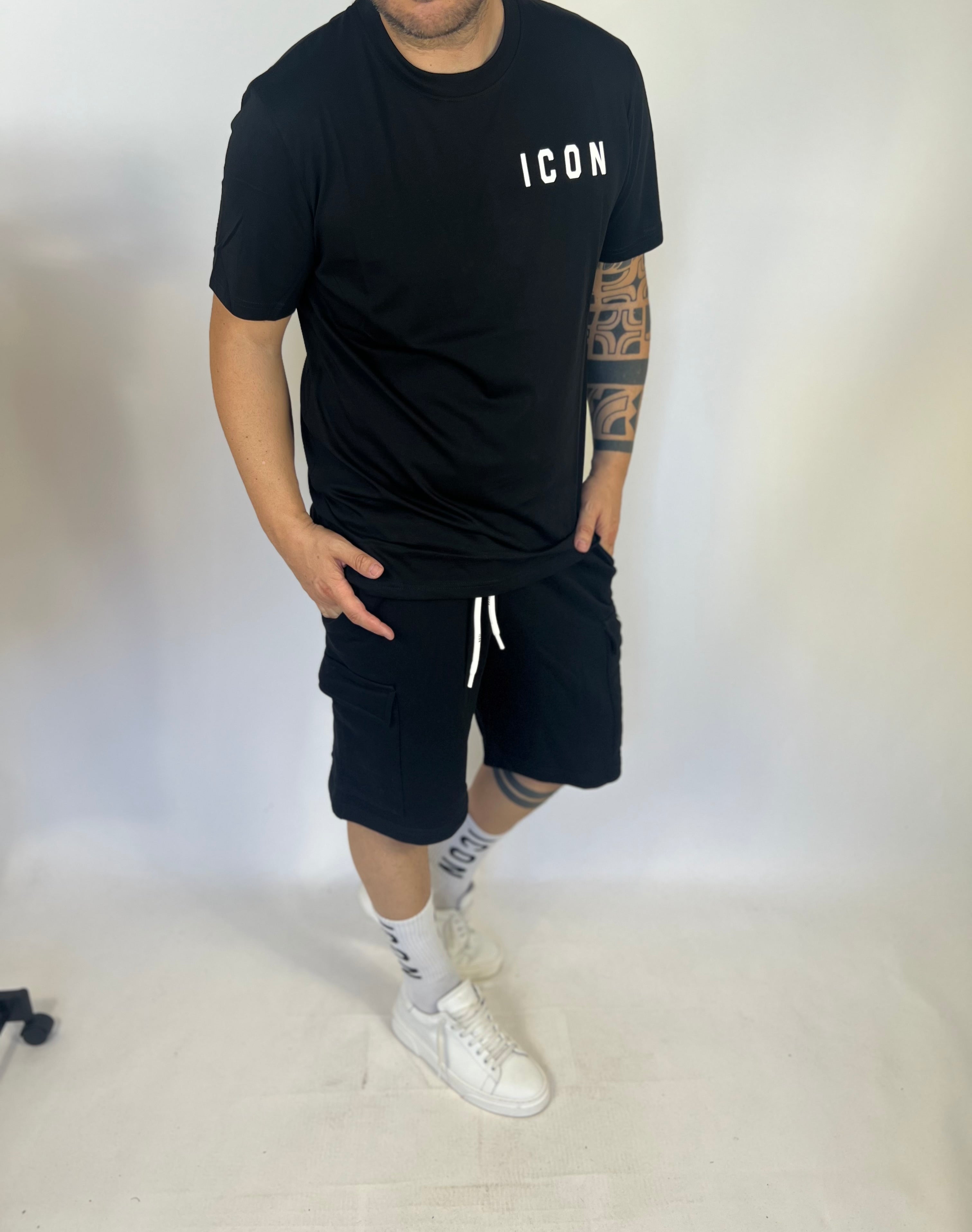 Completo : nero , tessuto 100% cotone , girocollo , Vestibilita ‘ normale , bermuda con tasche lacci in vita regolabili
