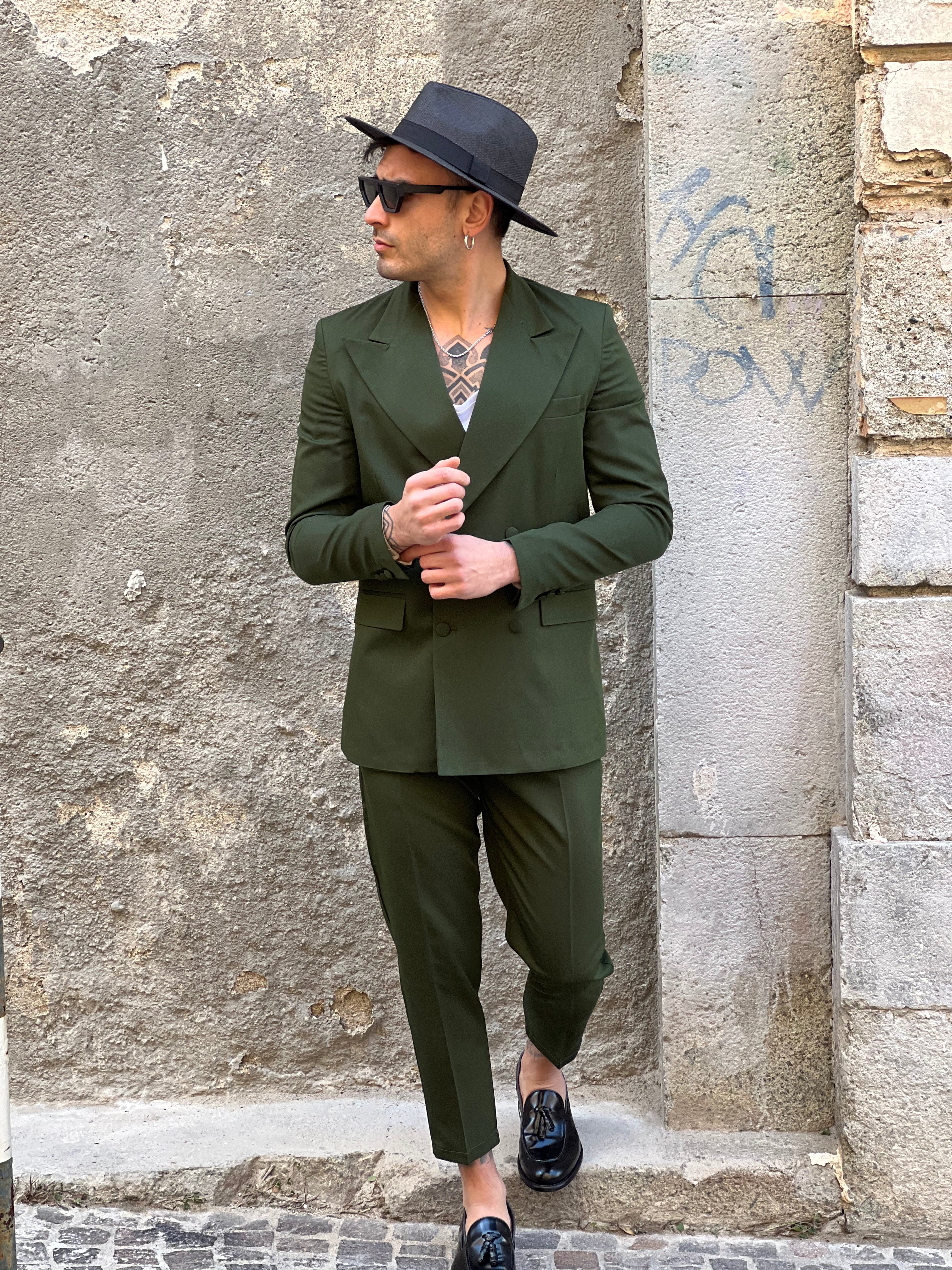 Abito giacca e pantalone , doppio petto , poco over size , il modello indossa una taglia 46 , e alto 1,74 pesa 74 kg , tessuto cotone