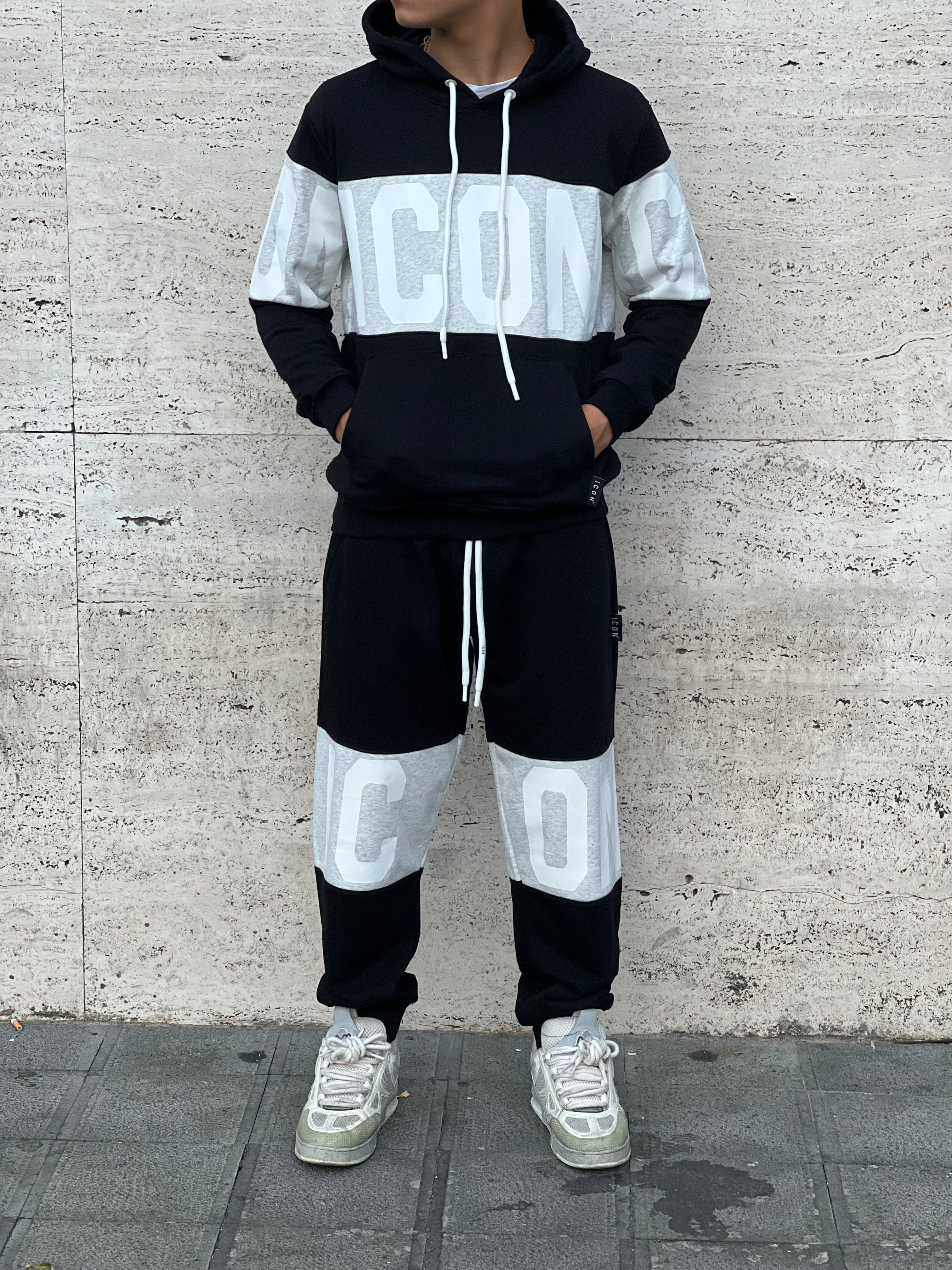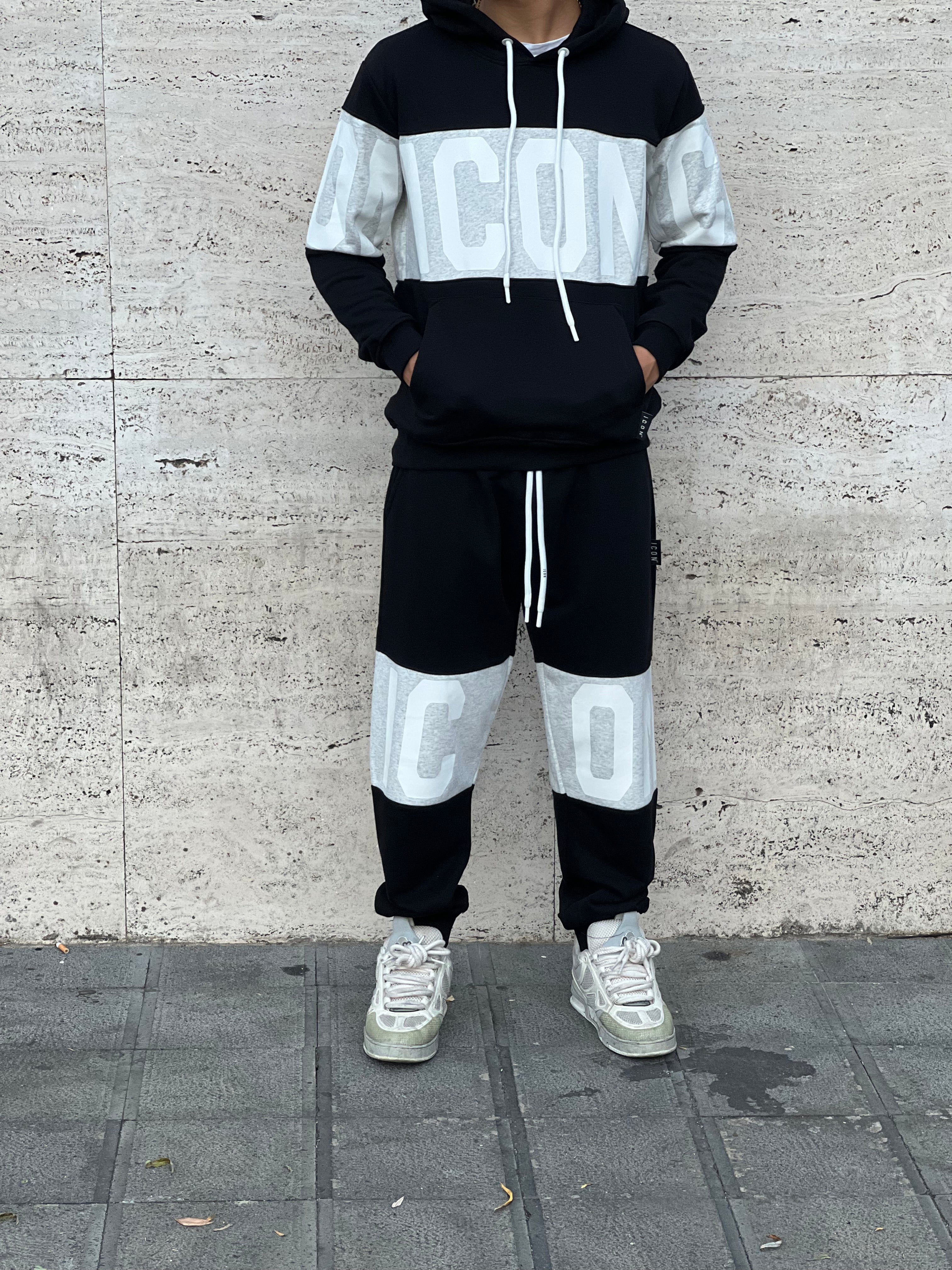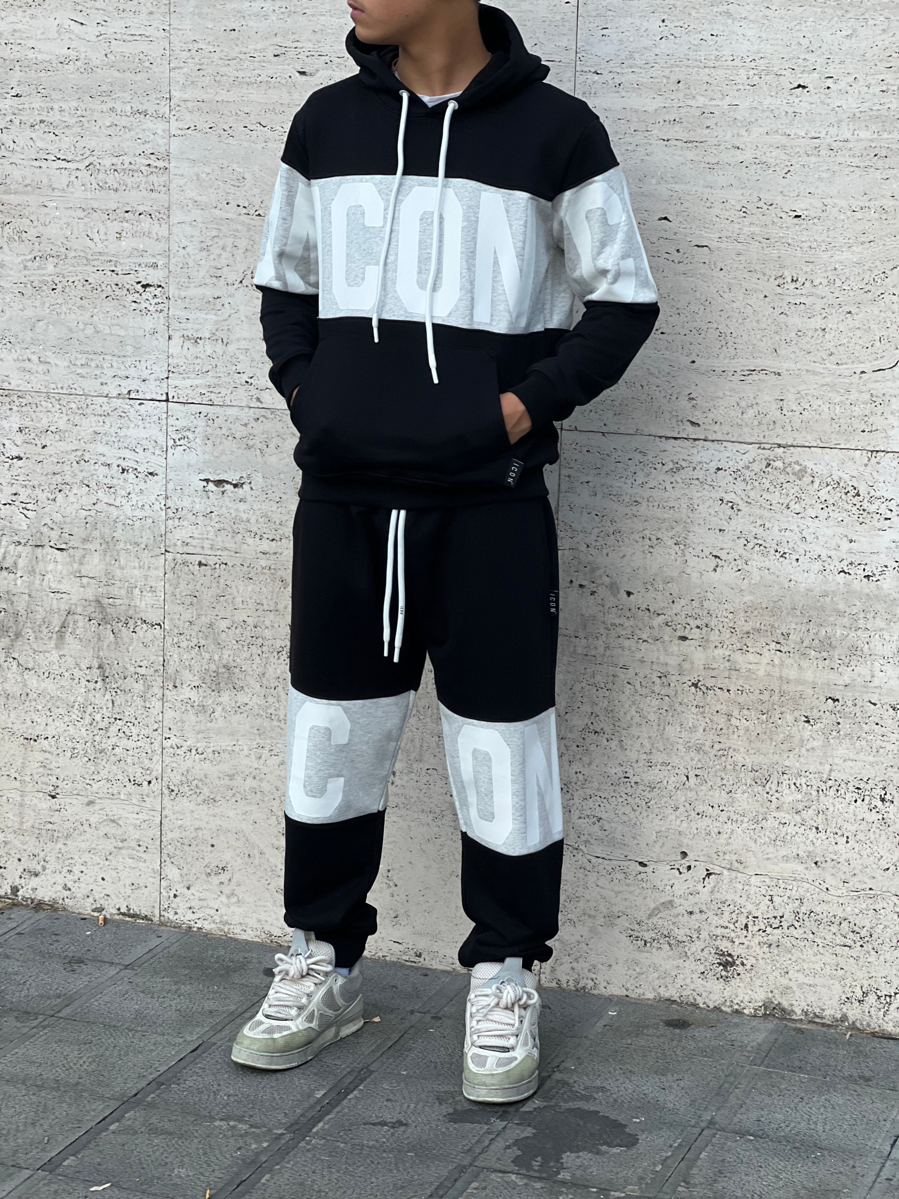 Completo icon colore bianco , stampa sul petto e schiena , capuccio , Vestibilita ‘ morbida