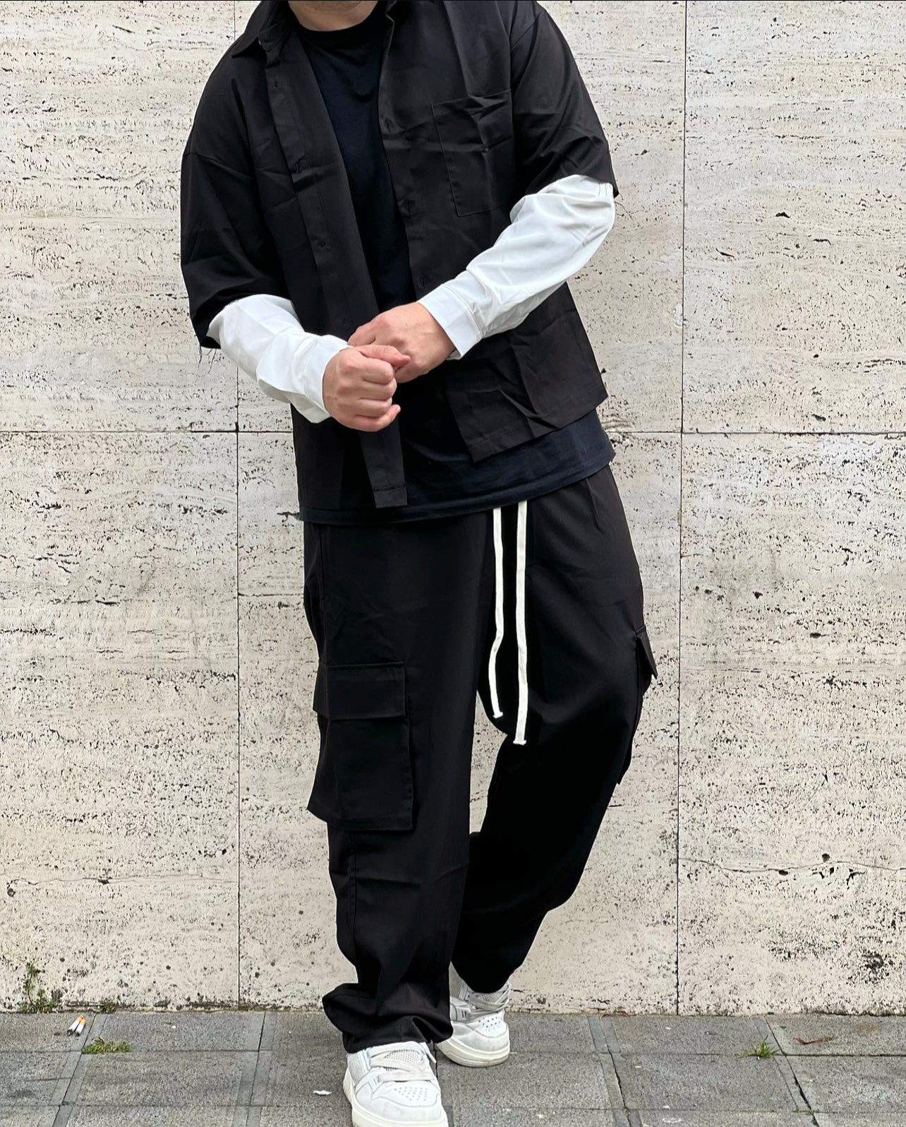 Completo : con camicia nera e manica bianca tutto un pezzo , bottoni , tessuto 100% cotone , Vestibilita’ poco over , pantalone Baggy , con tasconi
