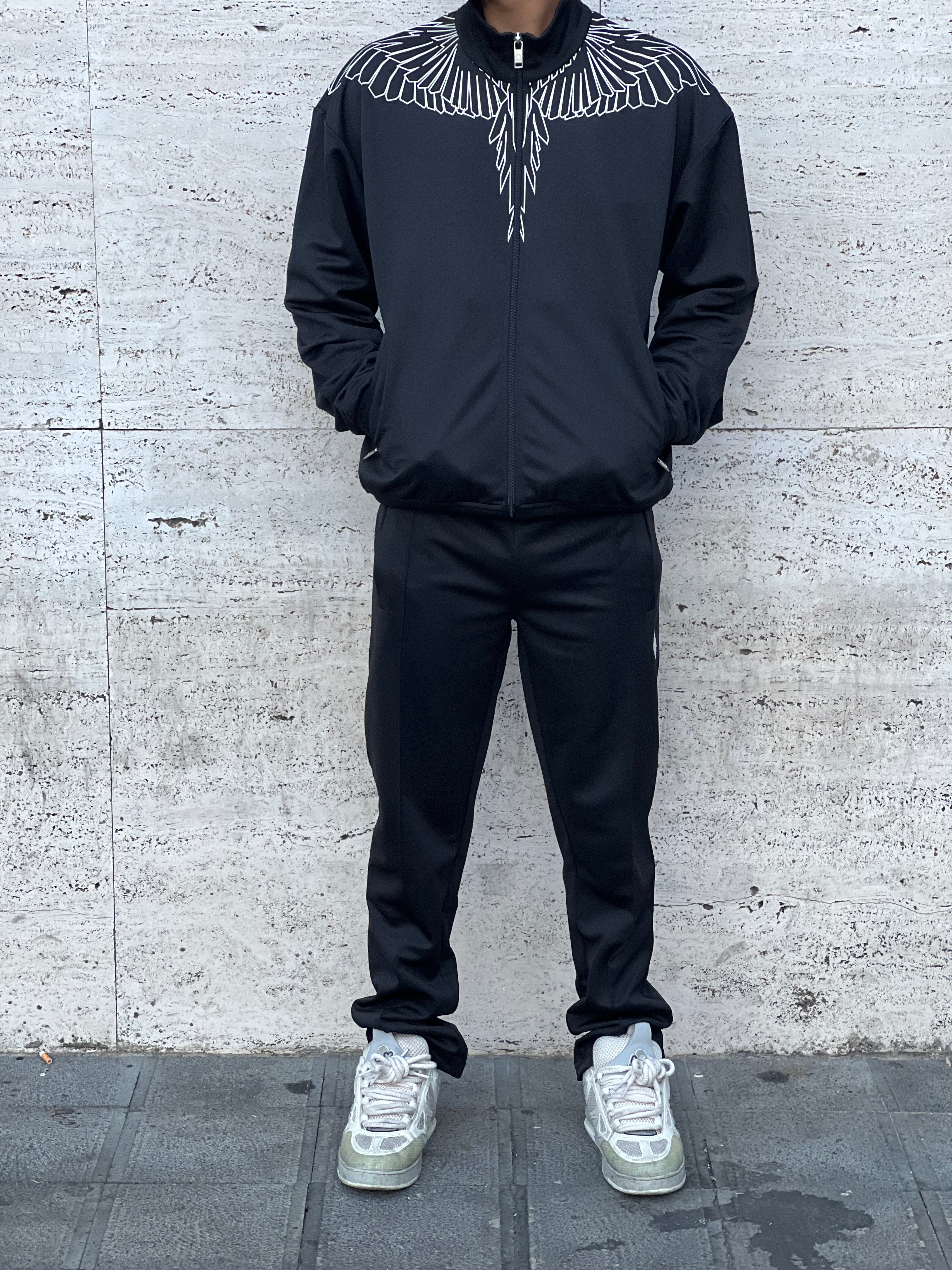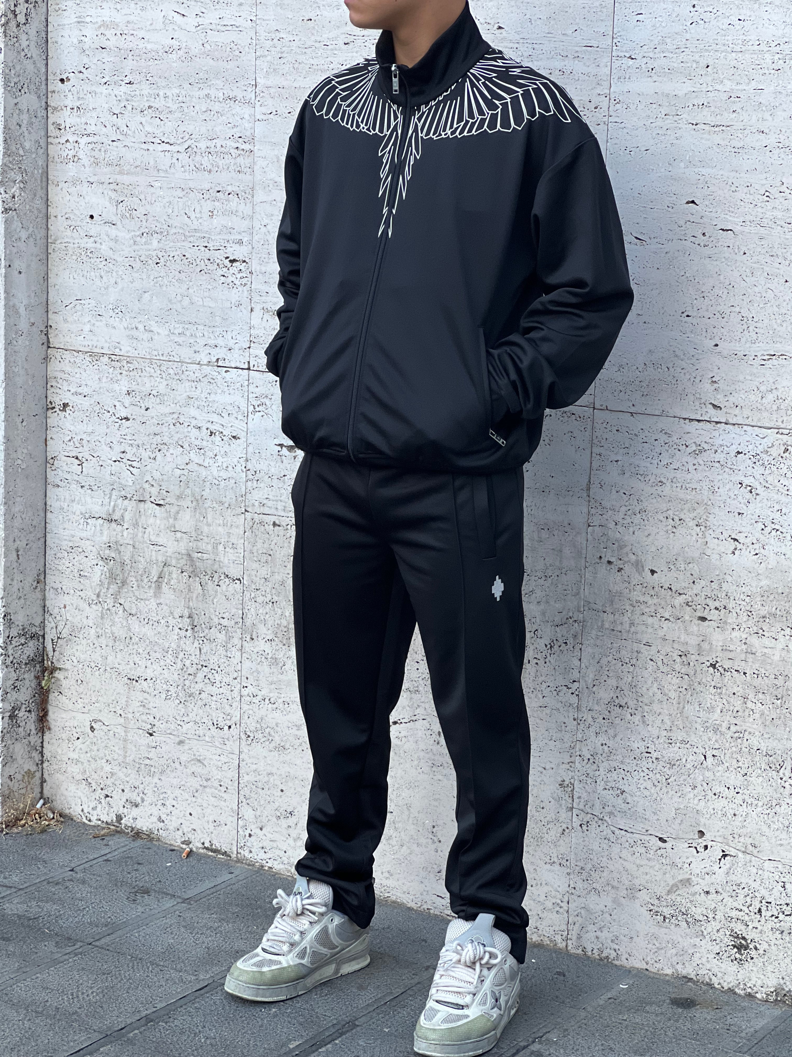 Completo icon colore nero , tessuto acetato , felpa con zip , disegno sul petto e laterale , Vestibilita ‘ morbida