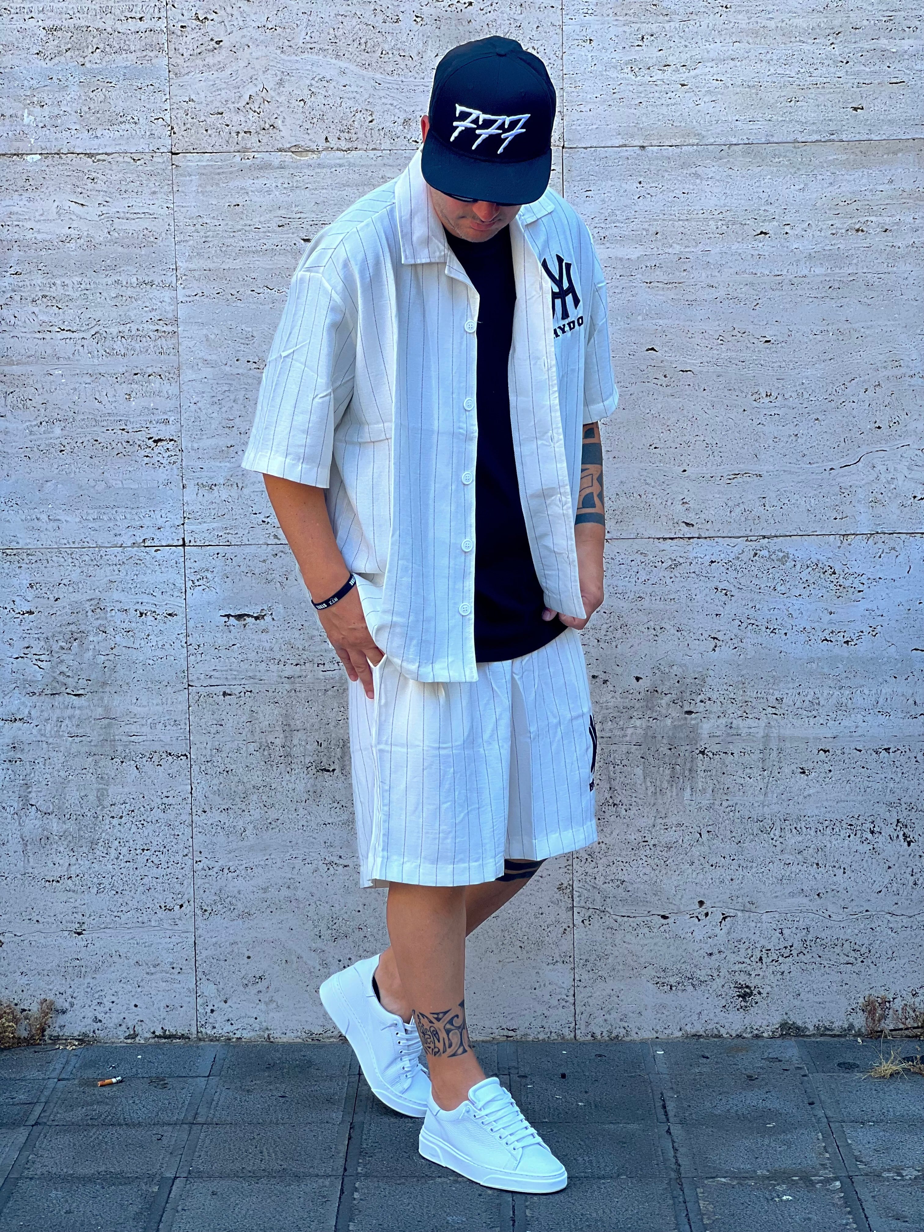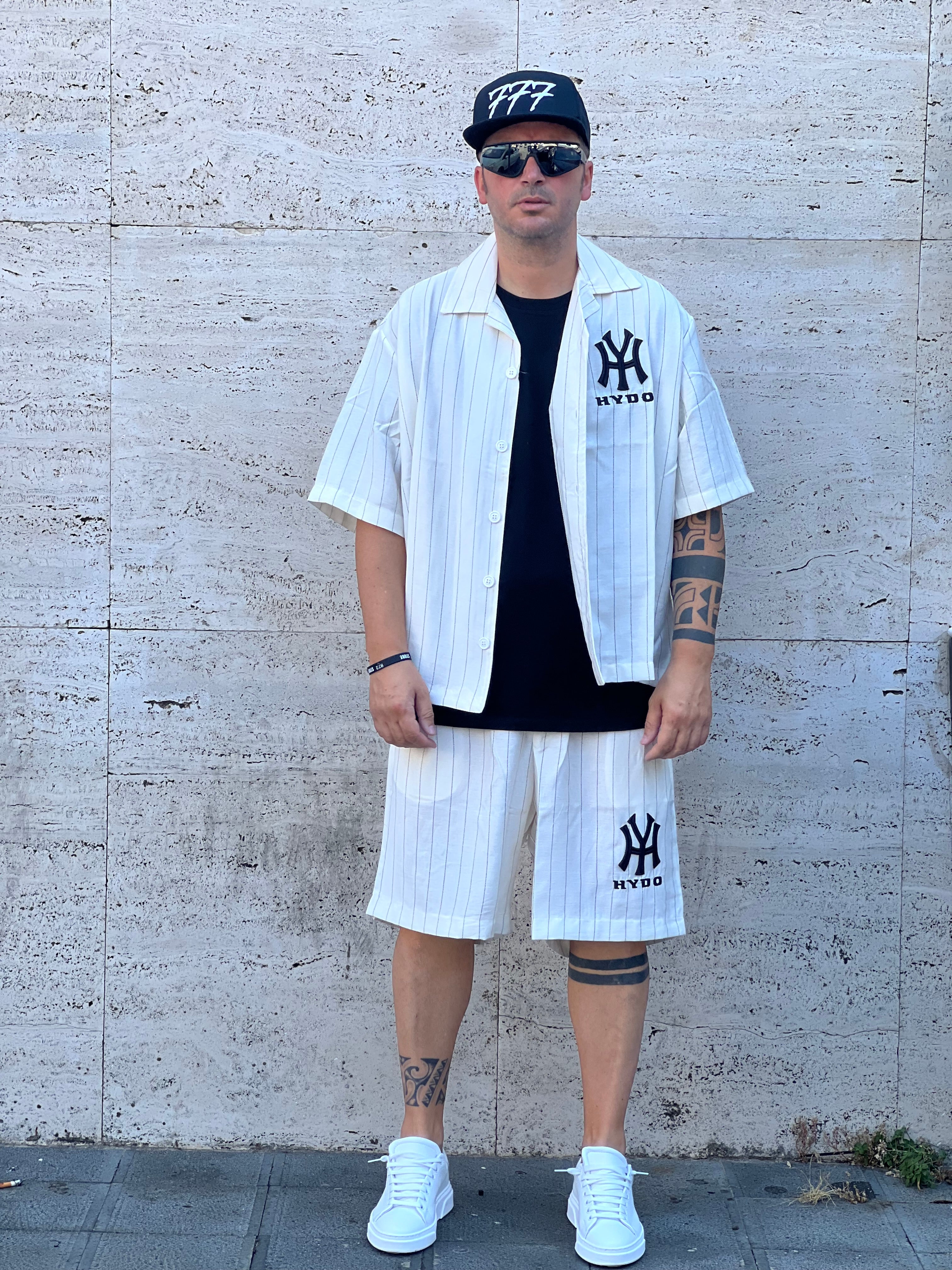 Completo : colore rosso a righe nere , camicia più bermuda con ricamo lato cuore