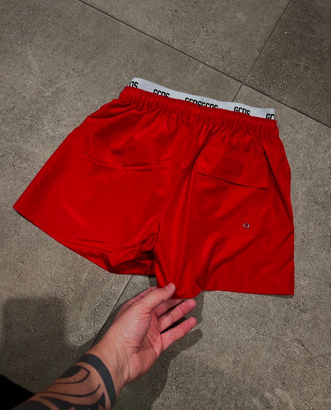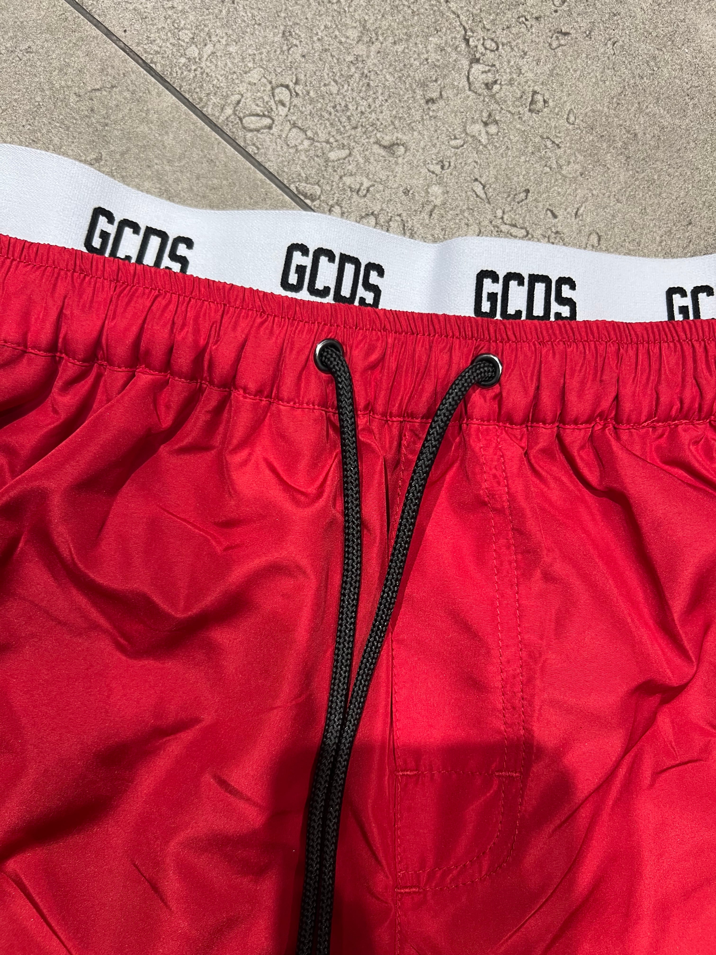 Costume : colore rosso con elastico bianco con scritte GCDS , ragazzi è una vera bomba , lacci ,