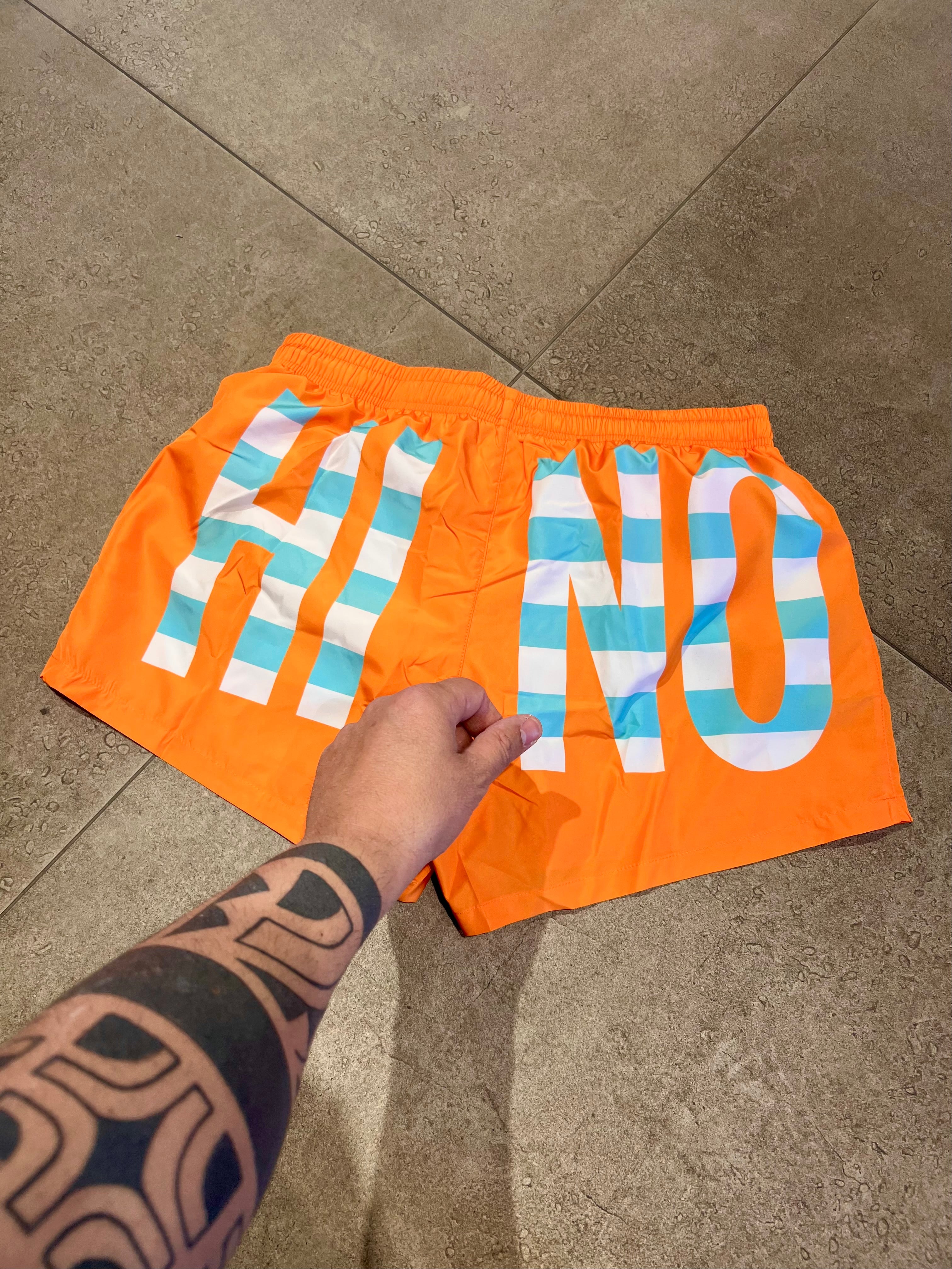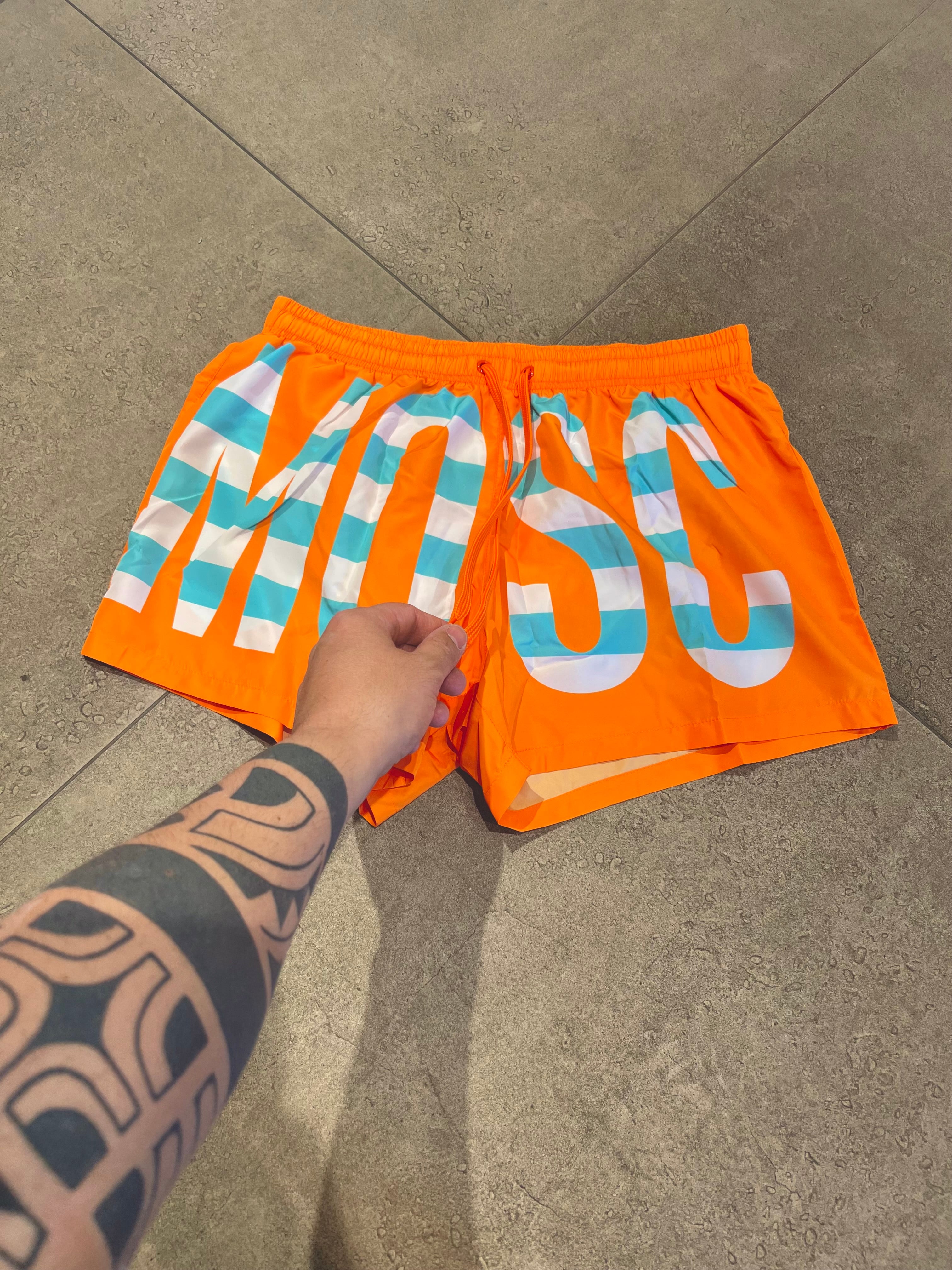 Costume arancione con scritte celesti e bianche , con scritta Moschino , molla in vita regolabile