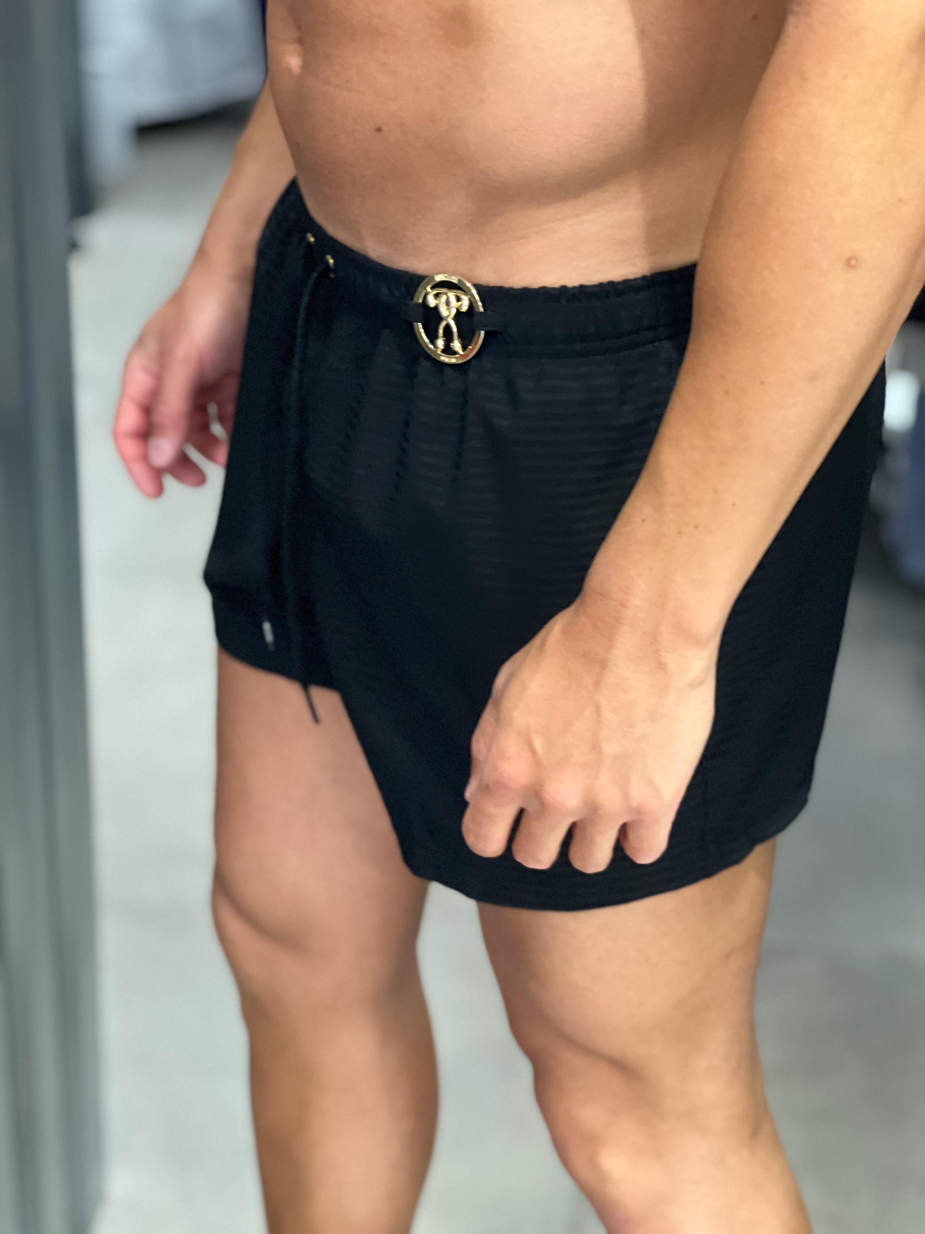 costume : tessuto tecnico con spilla dorata scritta Moschino