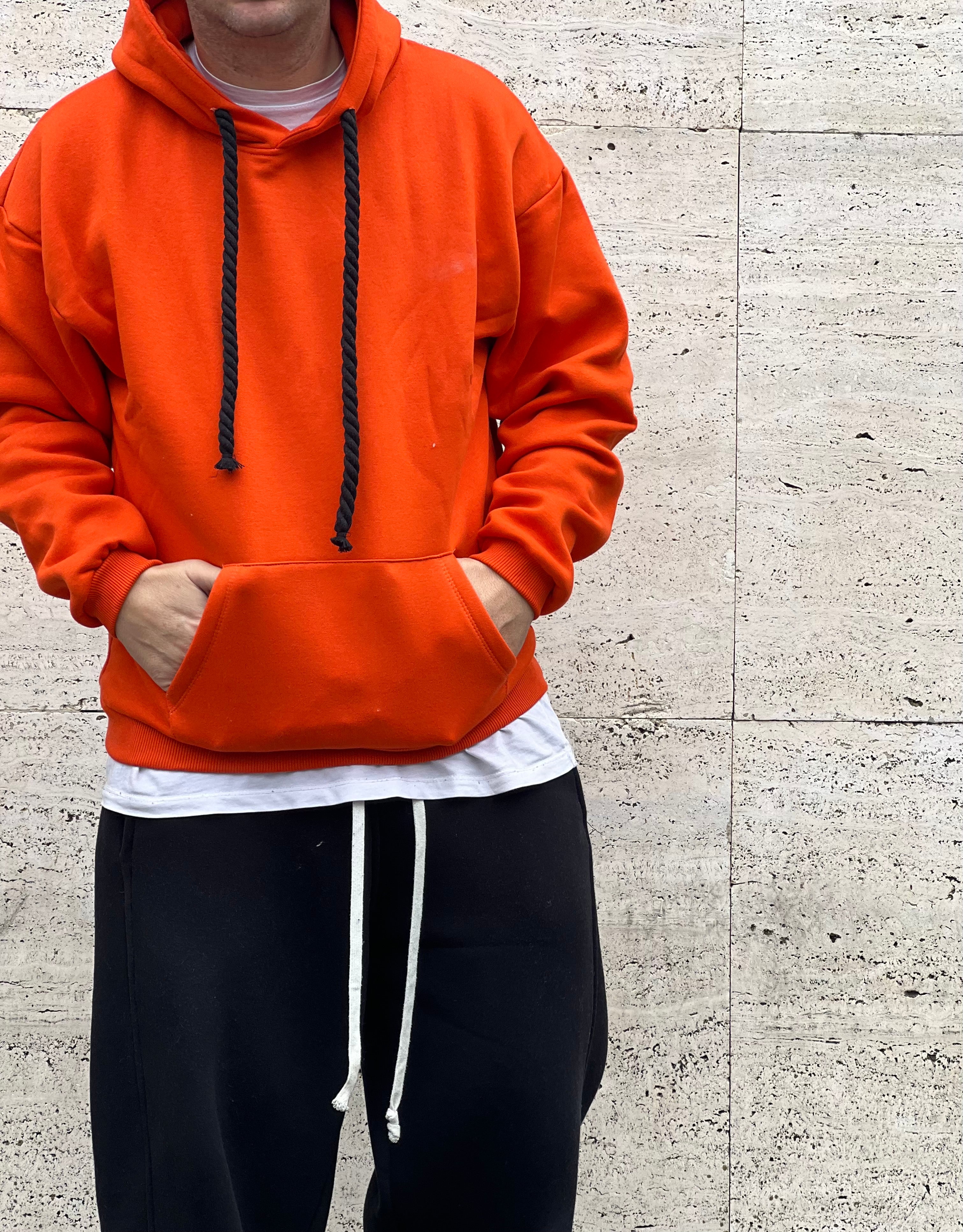 Felpa arancio ,con corda micidiale , Vestibilita’ comoda , capuccio , tasche davanti ,
