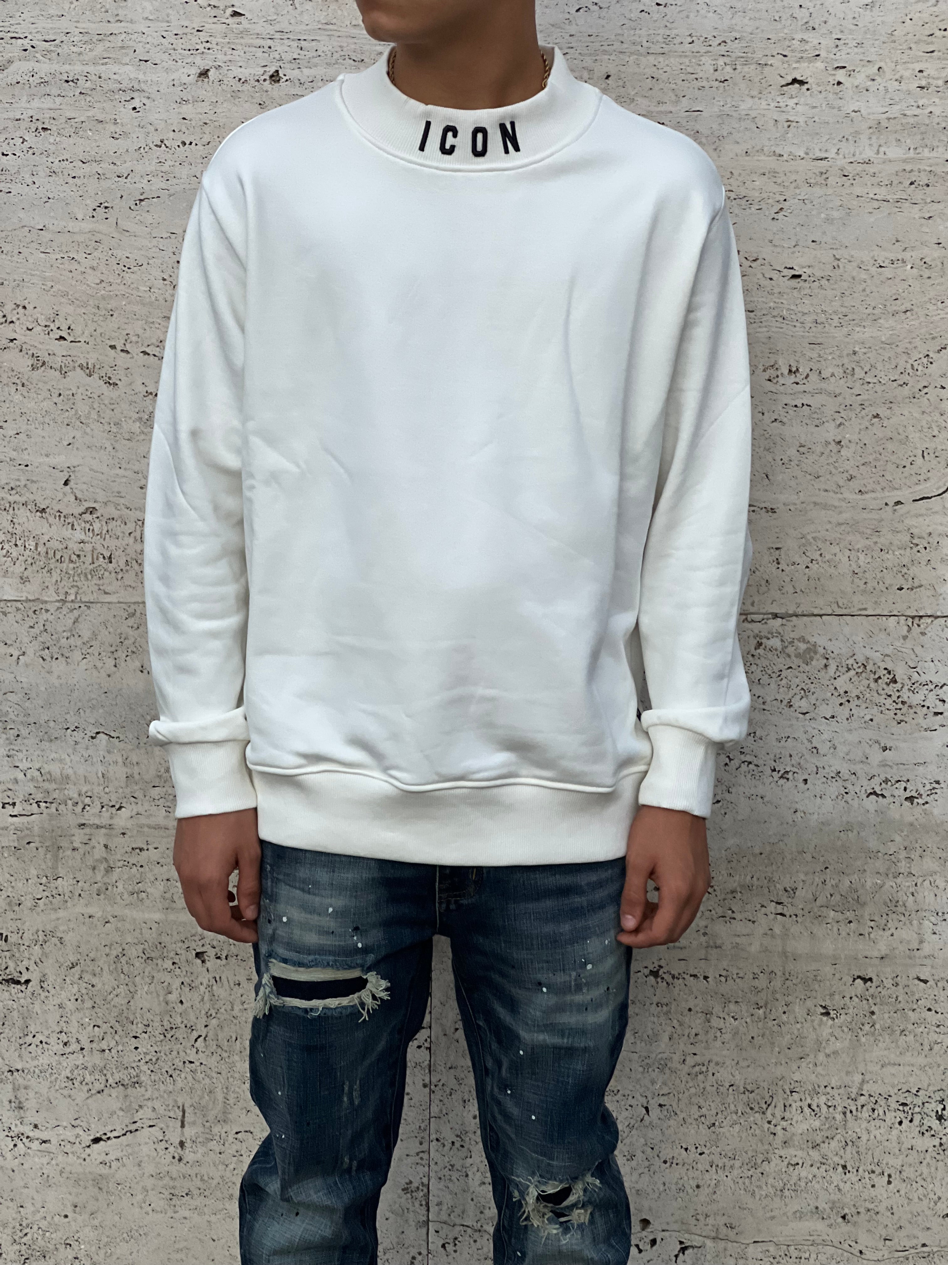 Felpa icon , colore bianco , mezzo collo con scritta , Vestibilita ‘ morbida ,
