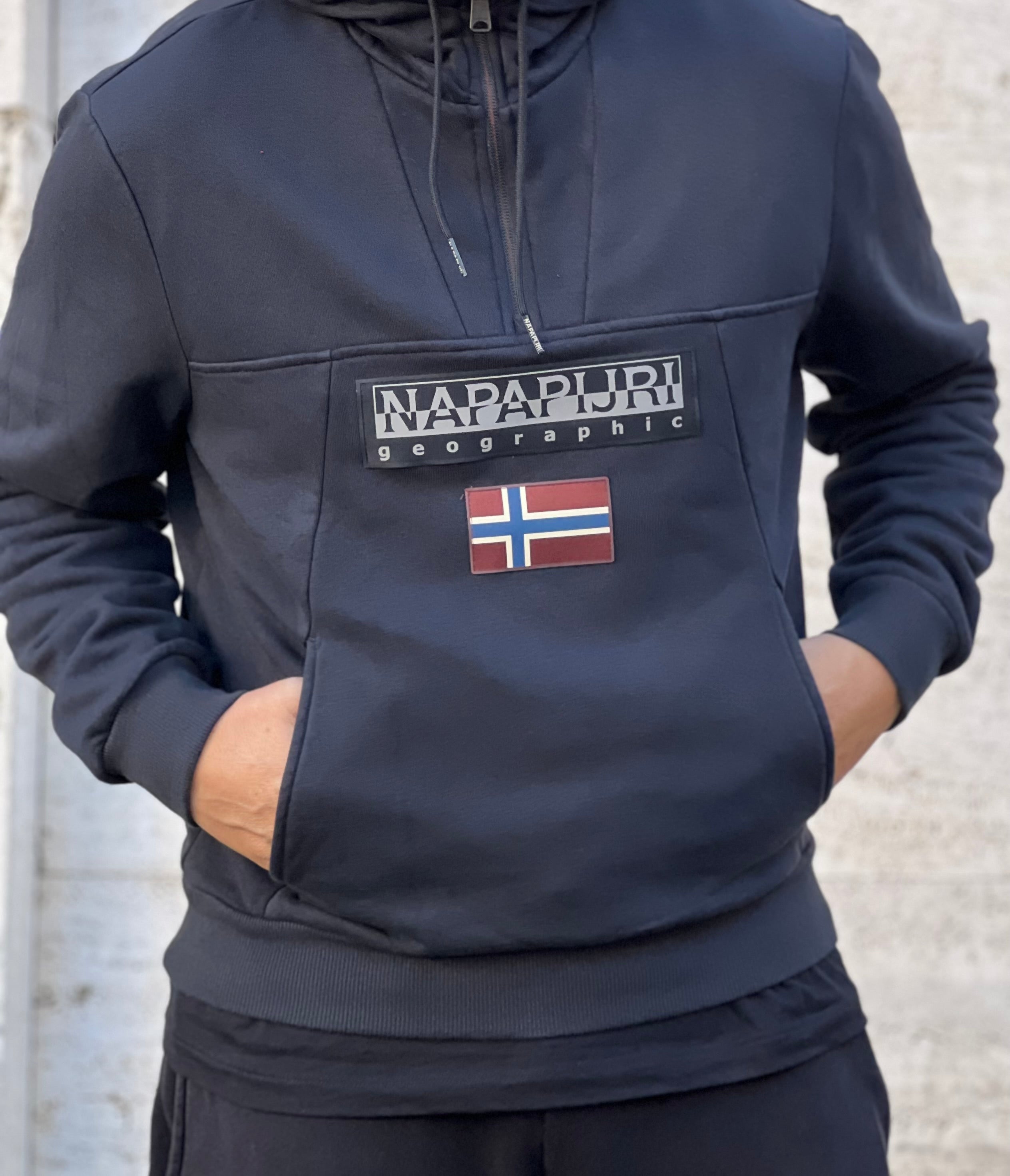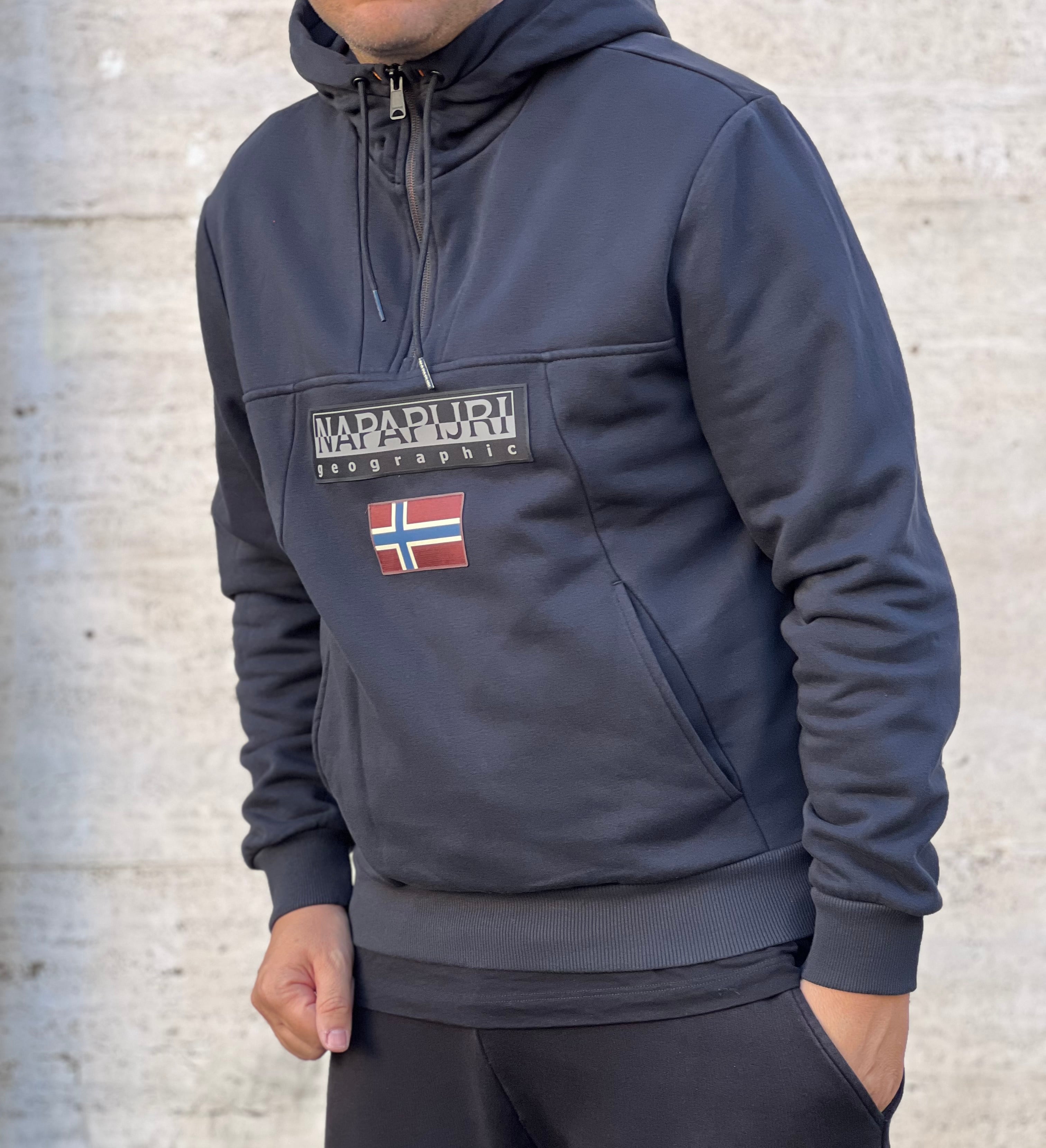 Felpa con capuccio , cerniera alla gola , colore blu notte , stampa ricamo petto , tessuto felpa