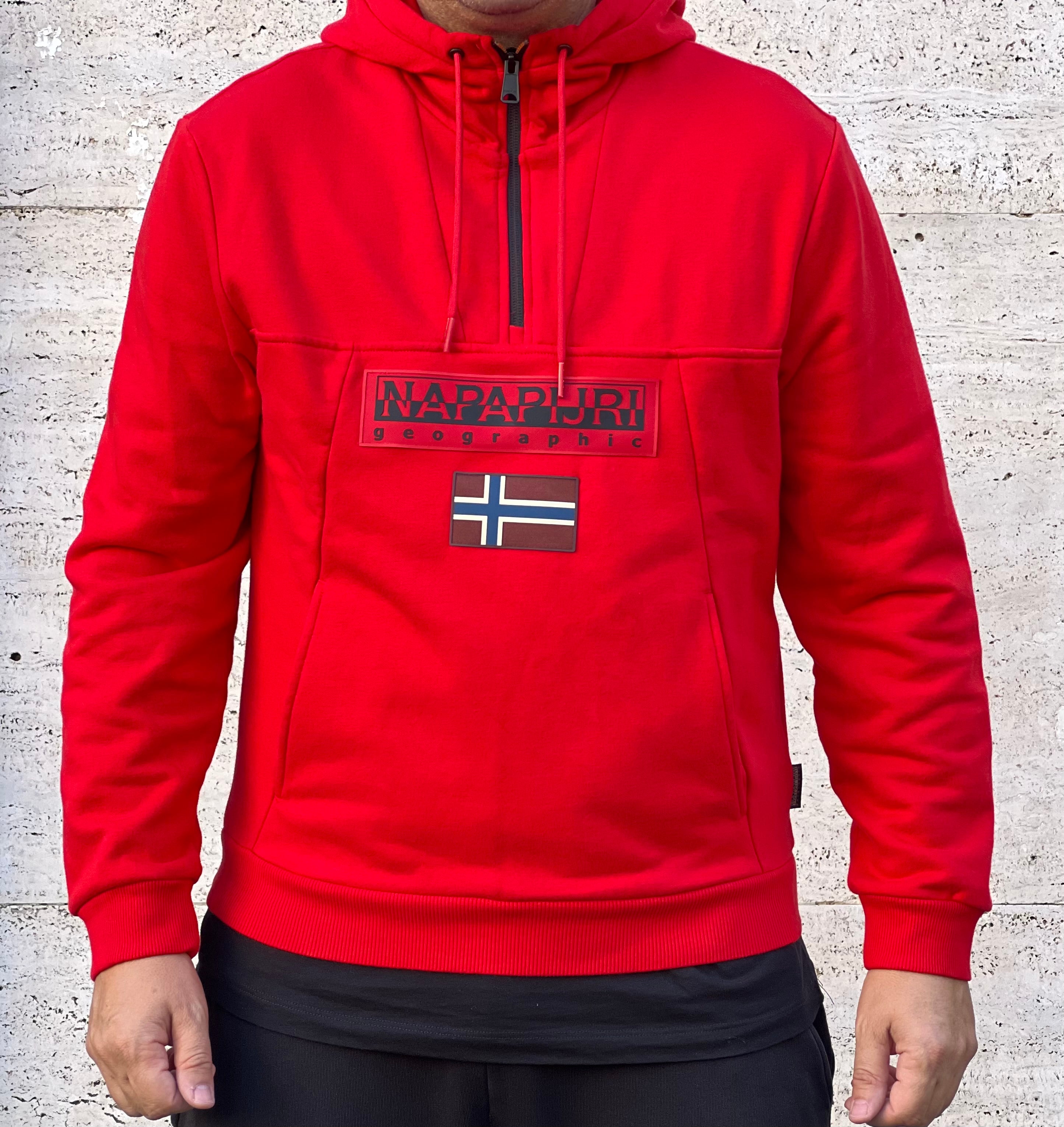 Felpa con capuccio , cerniera alla gola , colore rosso , stampa ricamo petto , tessuto felpa
