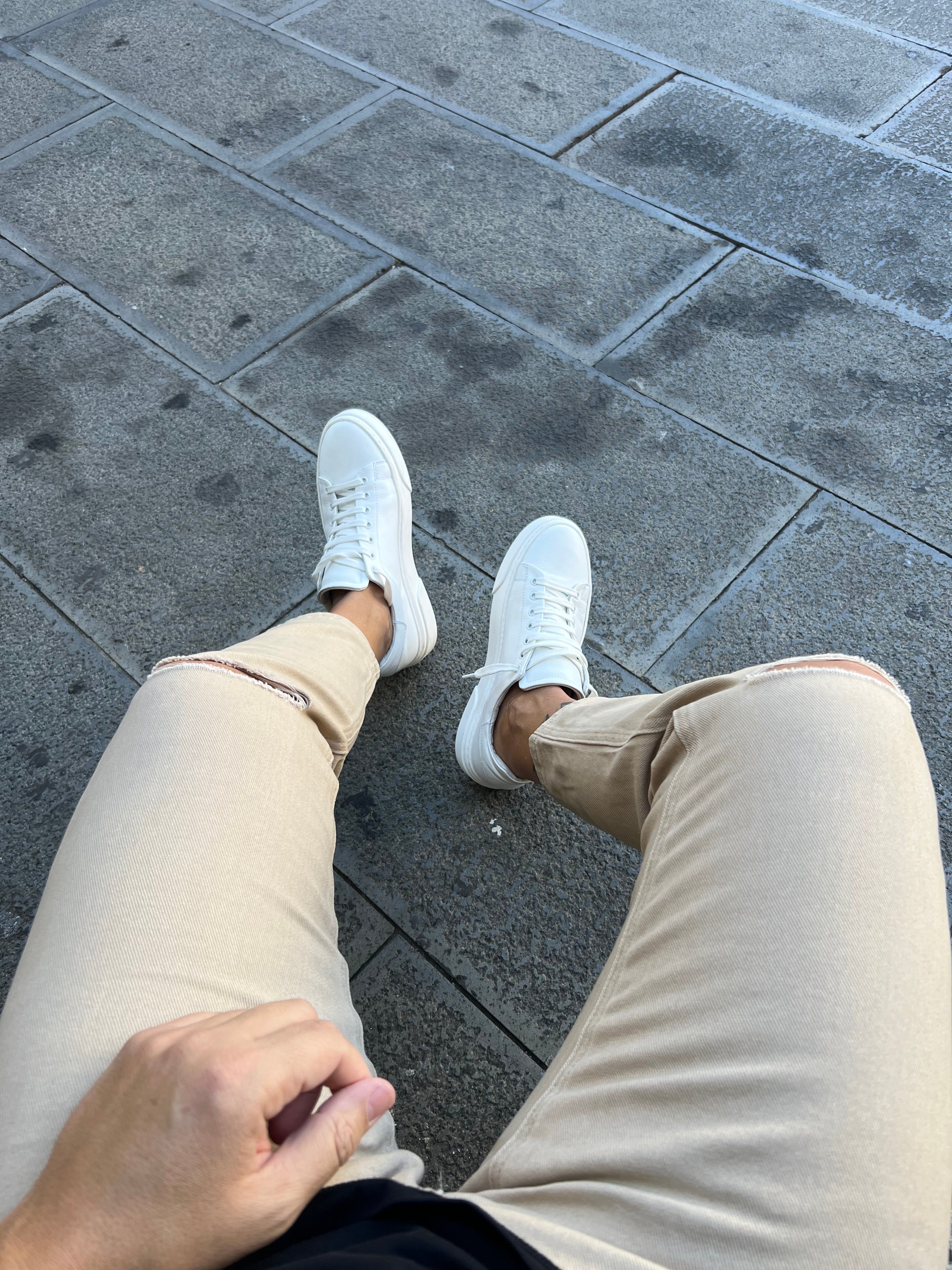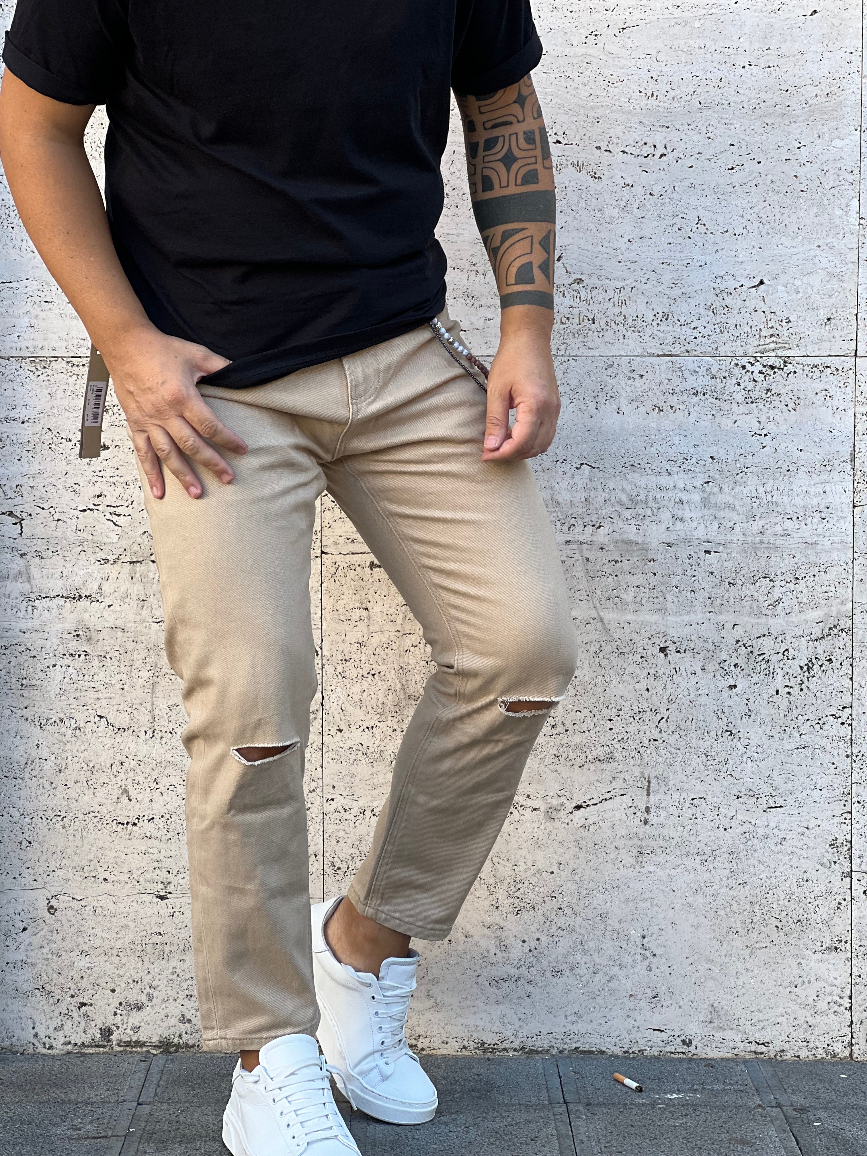 Jeans : colore beige chiaro , strappi al ginocchio , Vestibilita ‘ poco slim