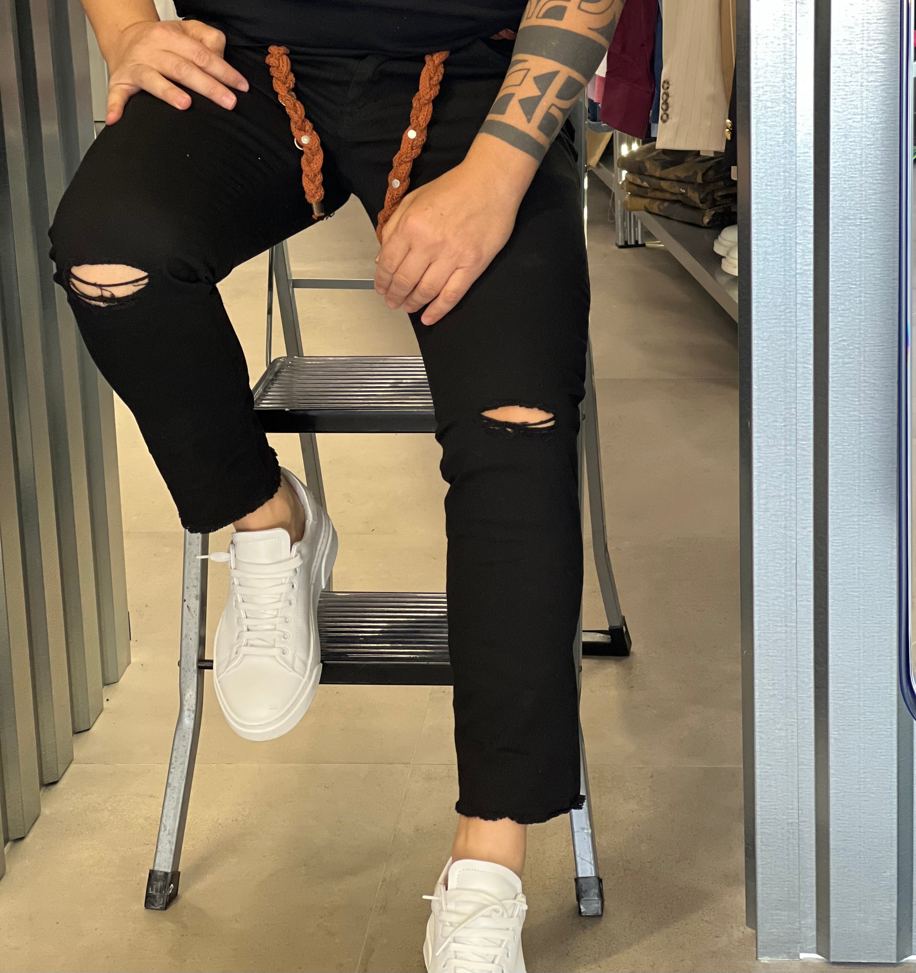 Jeans nero con strappi , corto alla caviglia , Vestibilita’ poco Slim, cinta in regalo