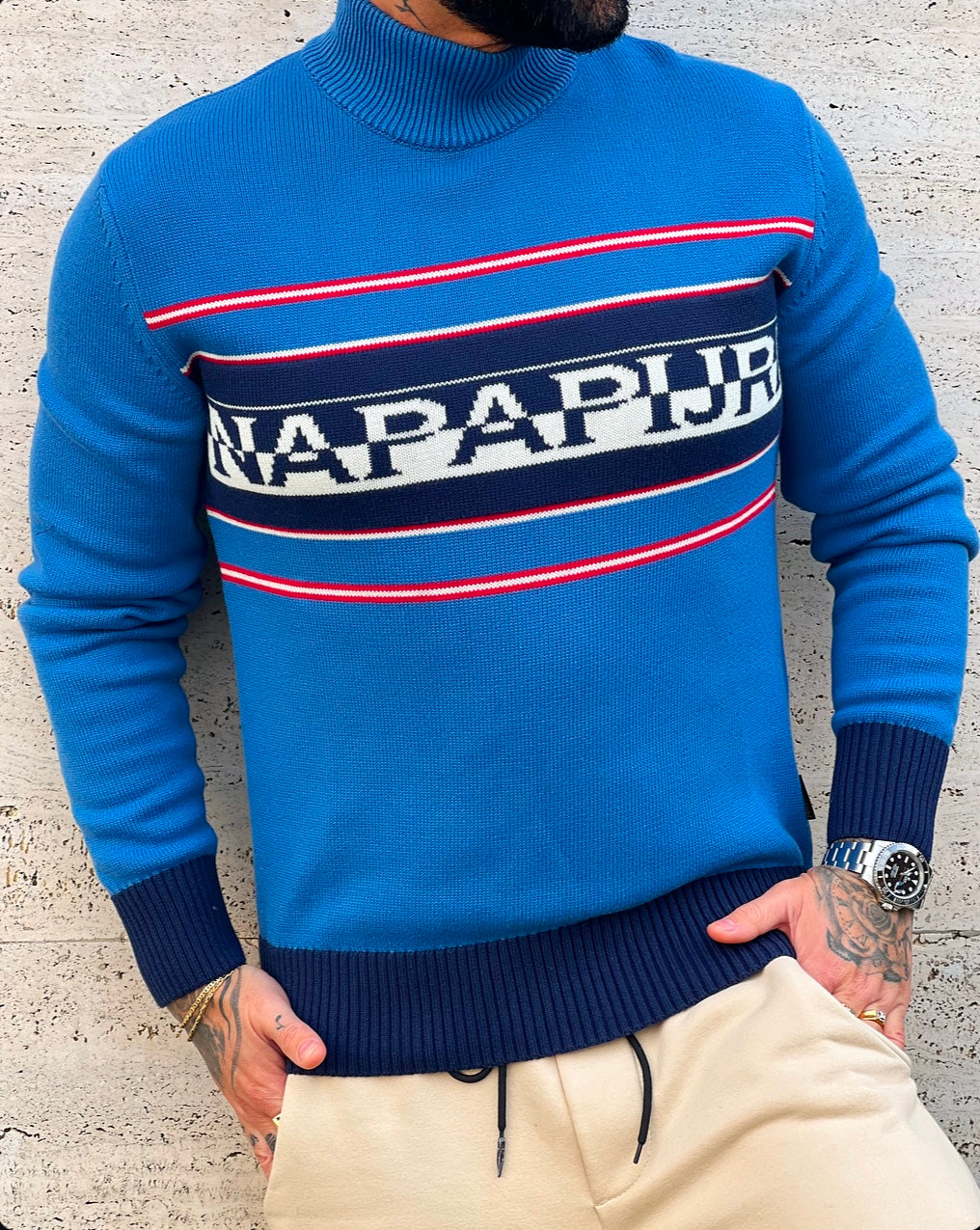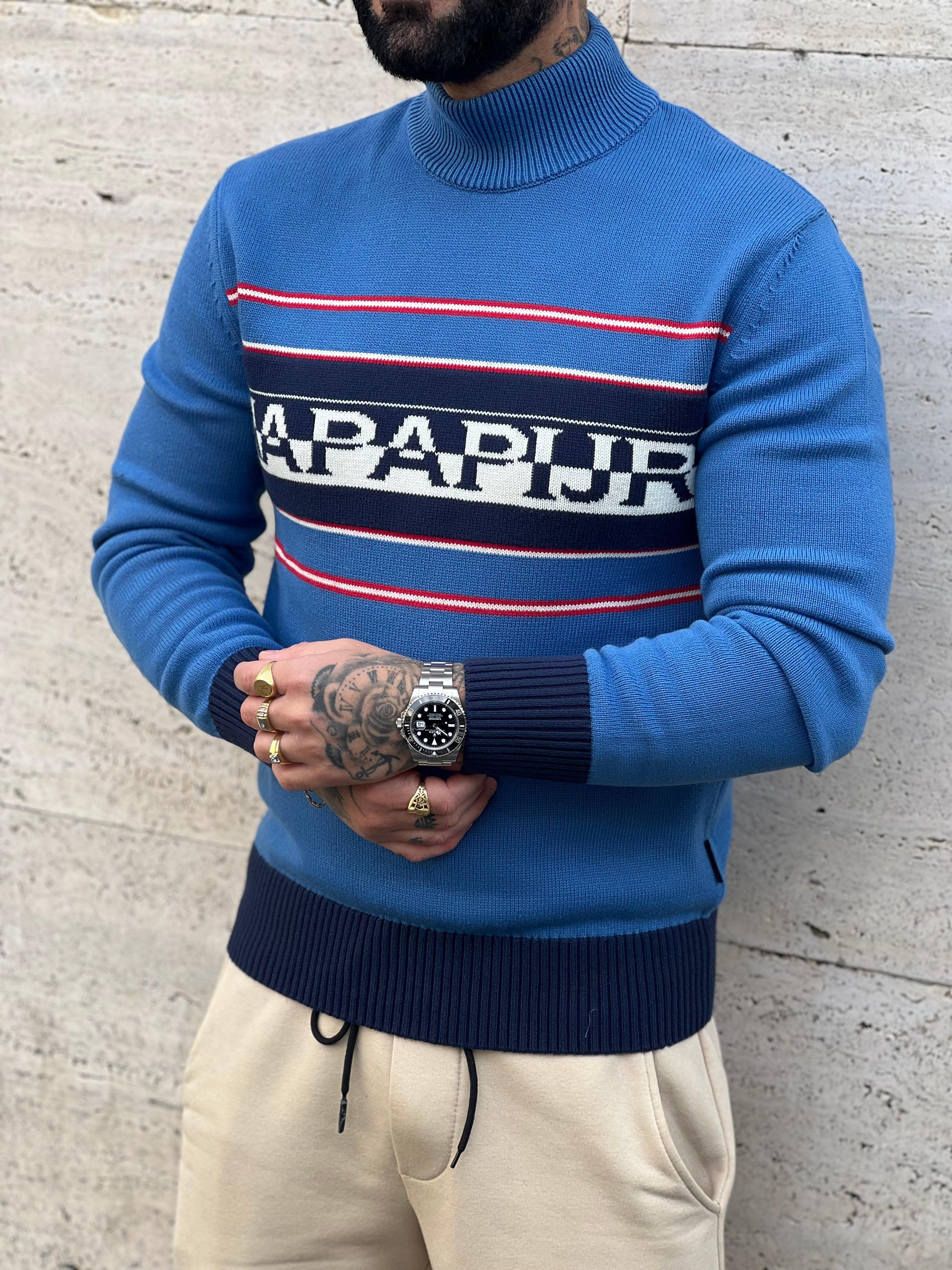 Maglione : colore blu , scritta al petto , mezzo collo