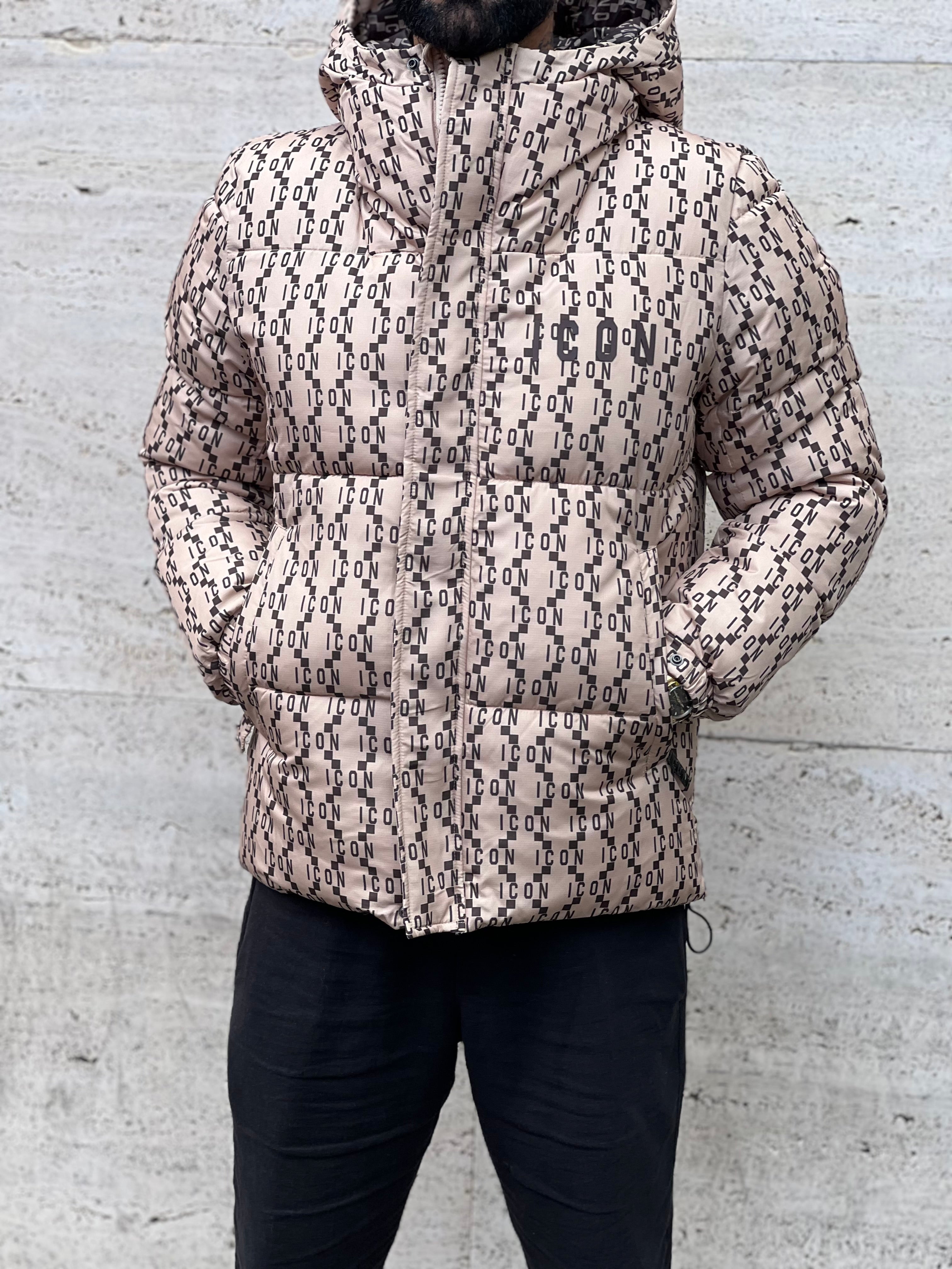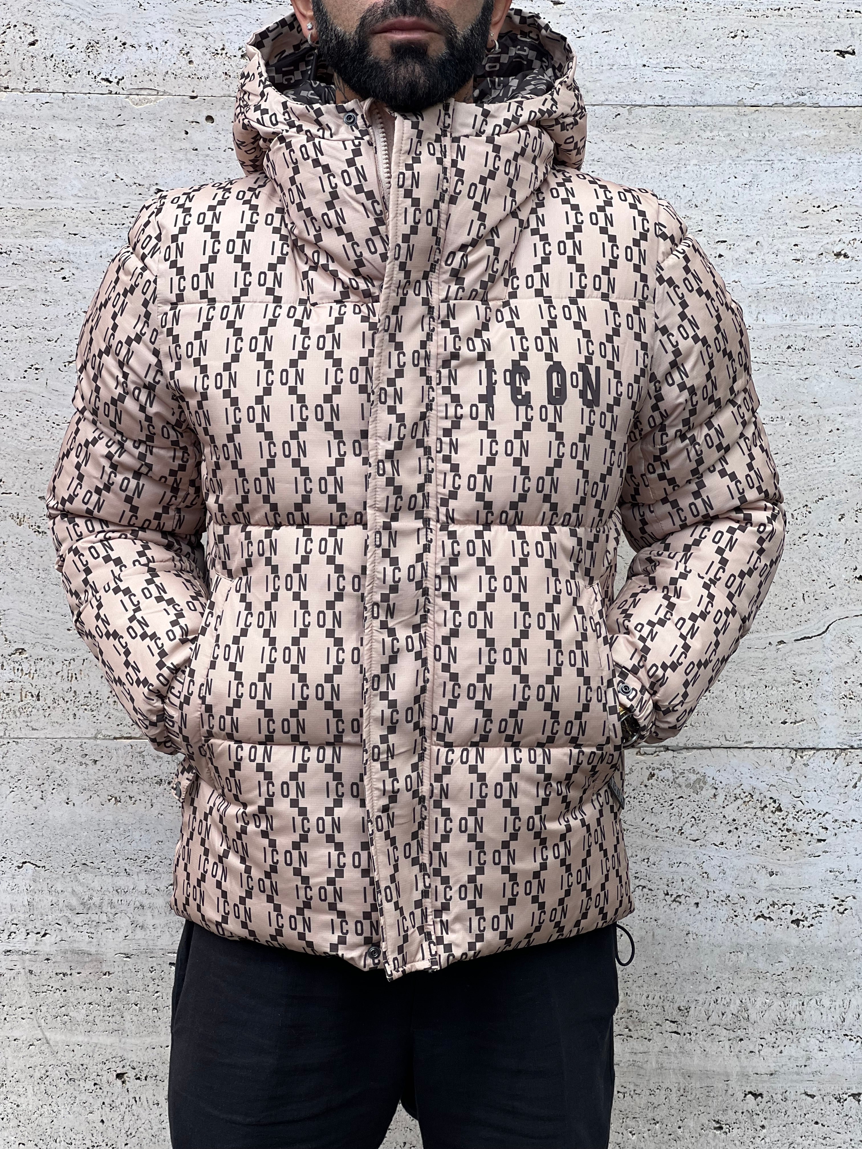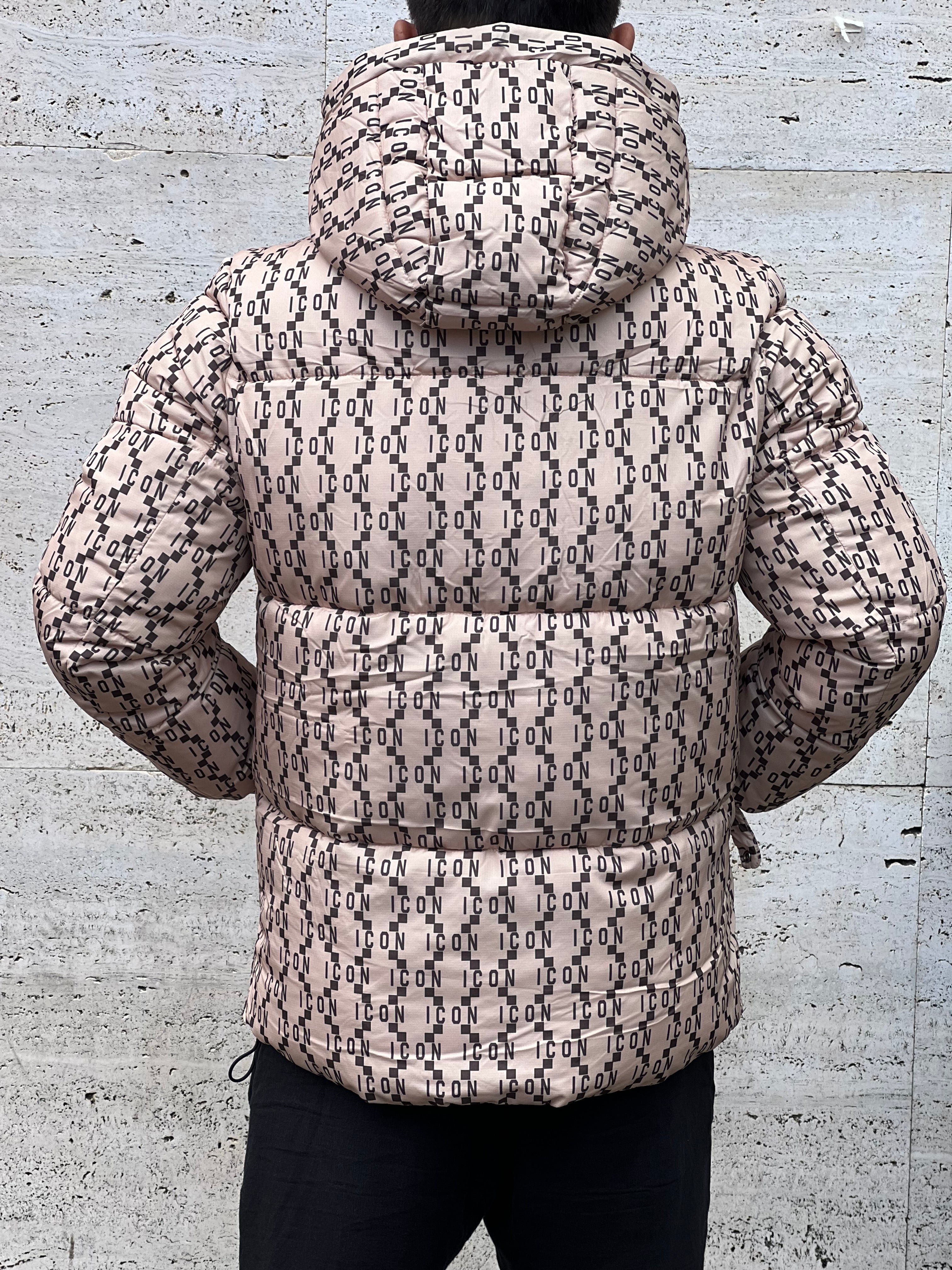 Piumino : , colore beige con scritte piccole , capuccio , scritta lato cuore