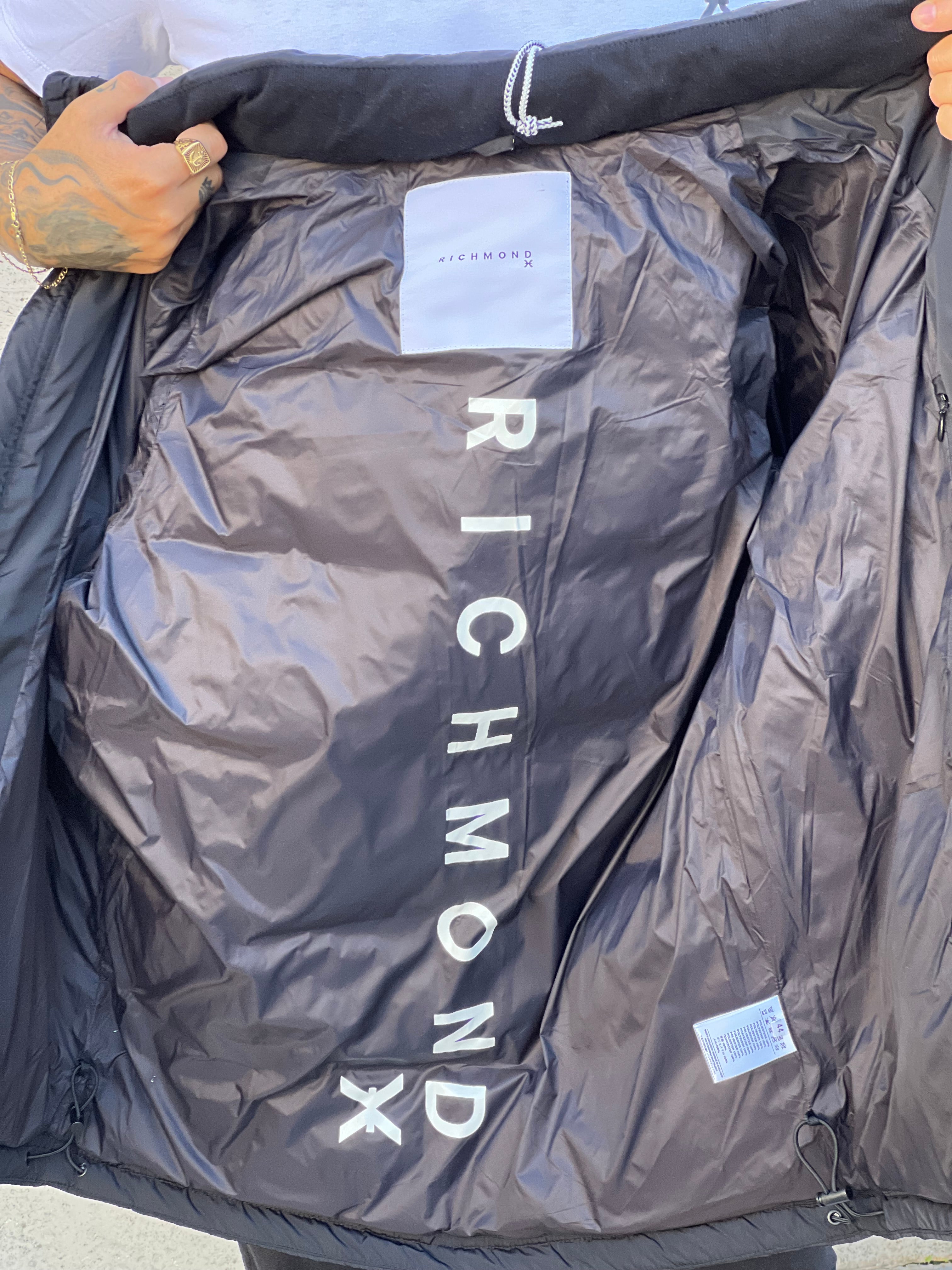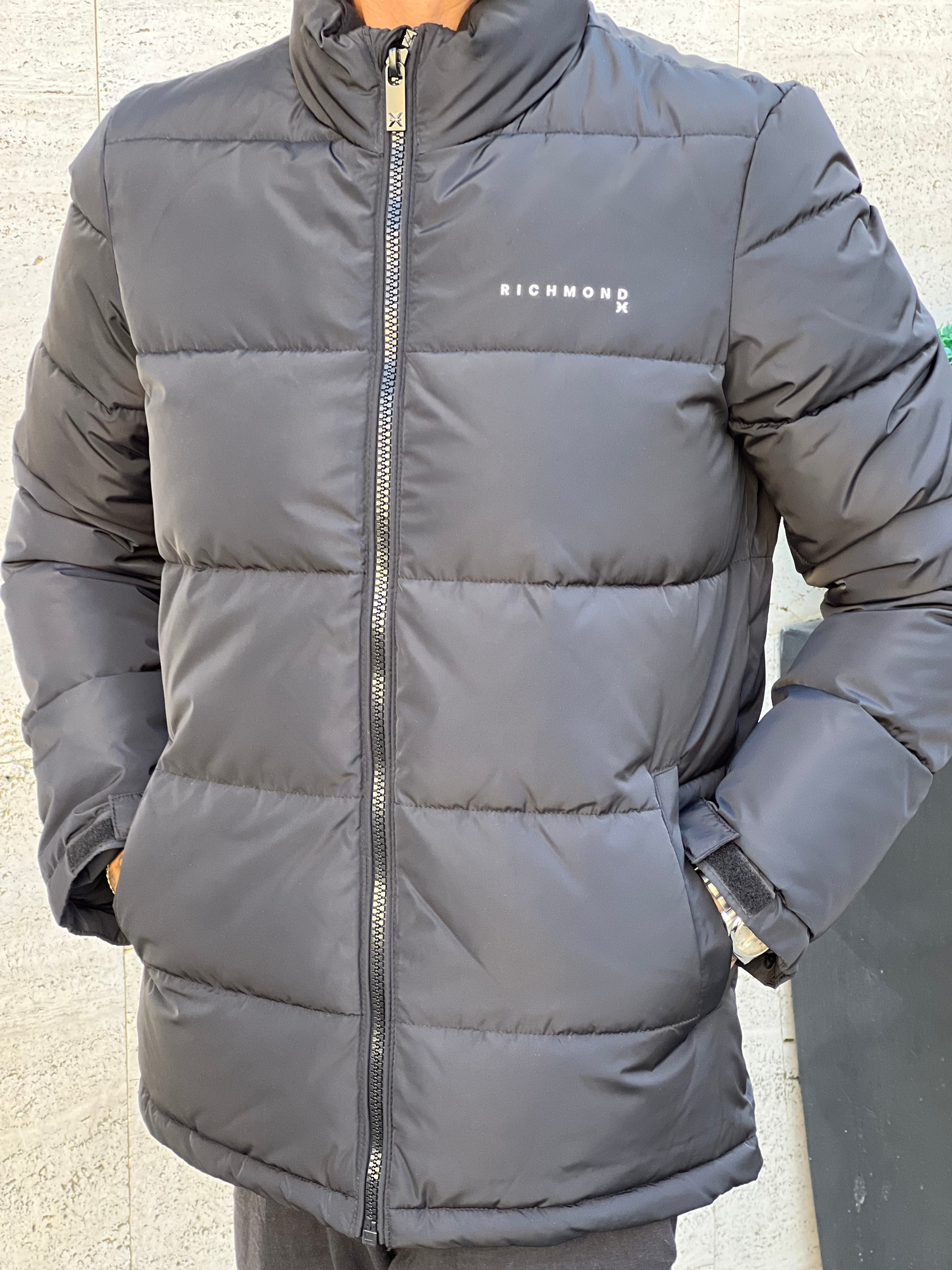 Piumino : caldo , con collo , colore nero , tasche , cerniere , stampa lato cuore , bretelle internamente quando lo vuoi togliere lo metti attaccato alla schiena ,