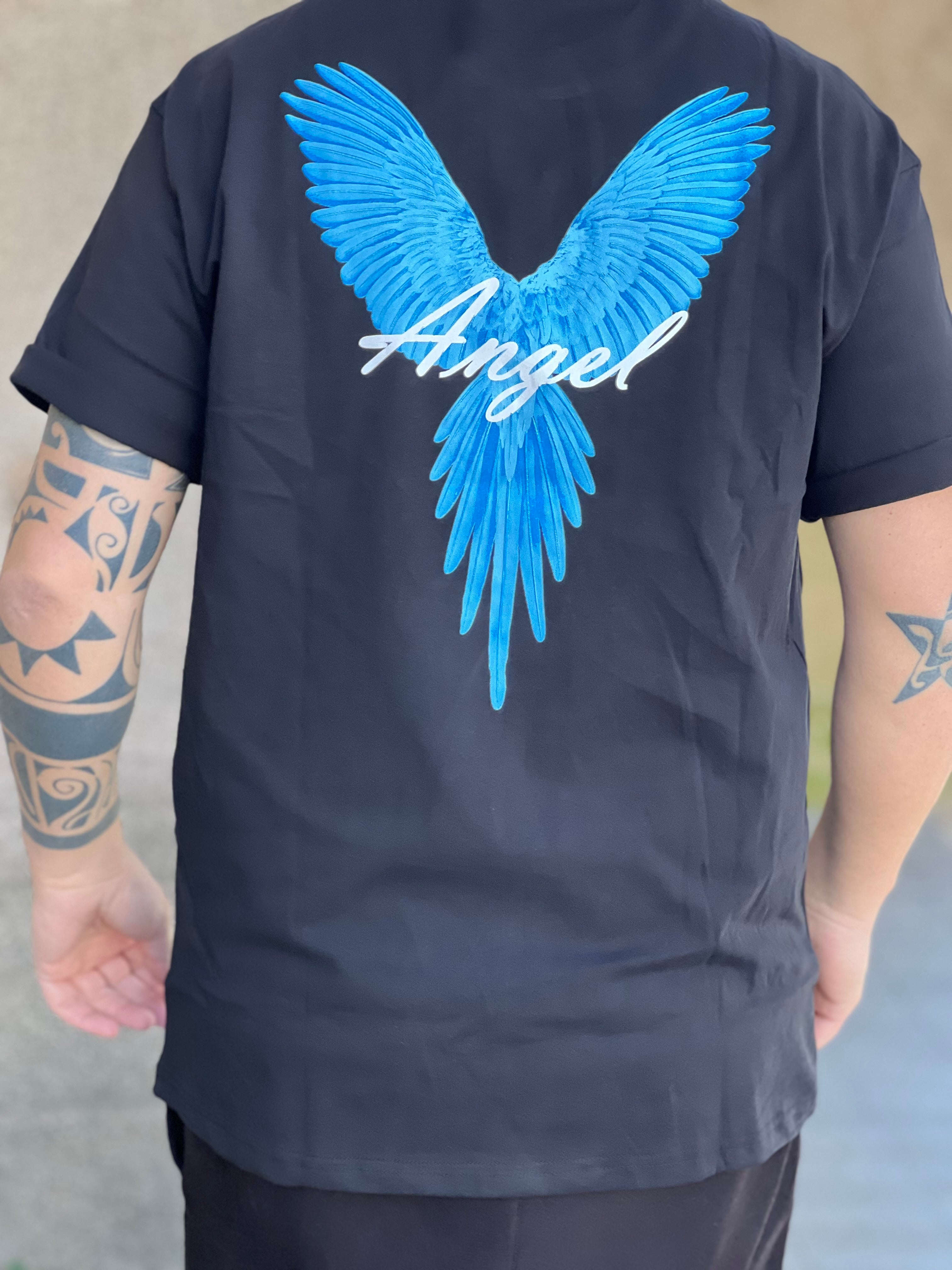 T-Shirt : con farfalla celeste davanti piccola , dietro grande , Vestibilita ‘ normale , girocollo