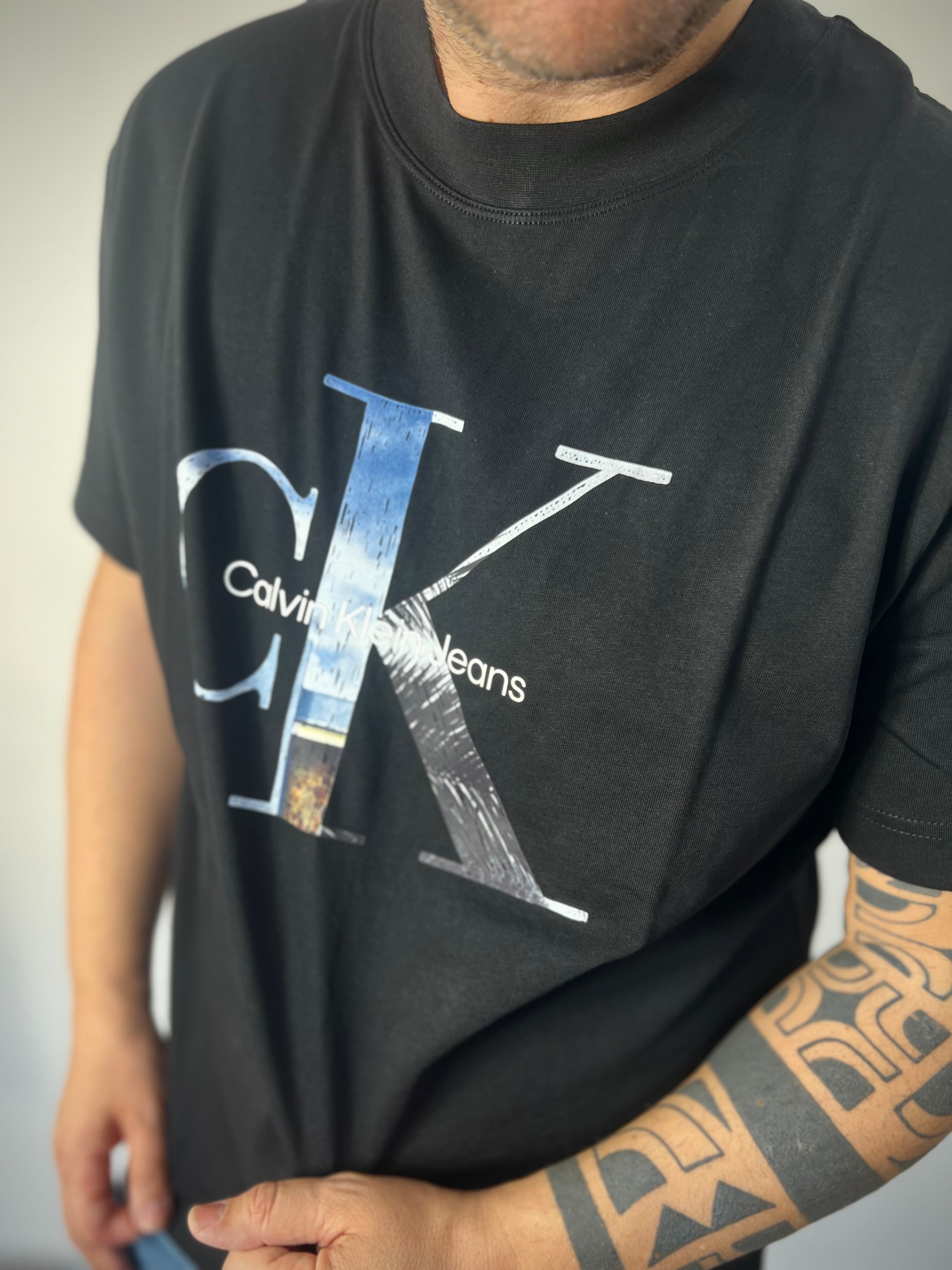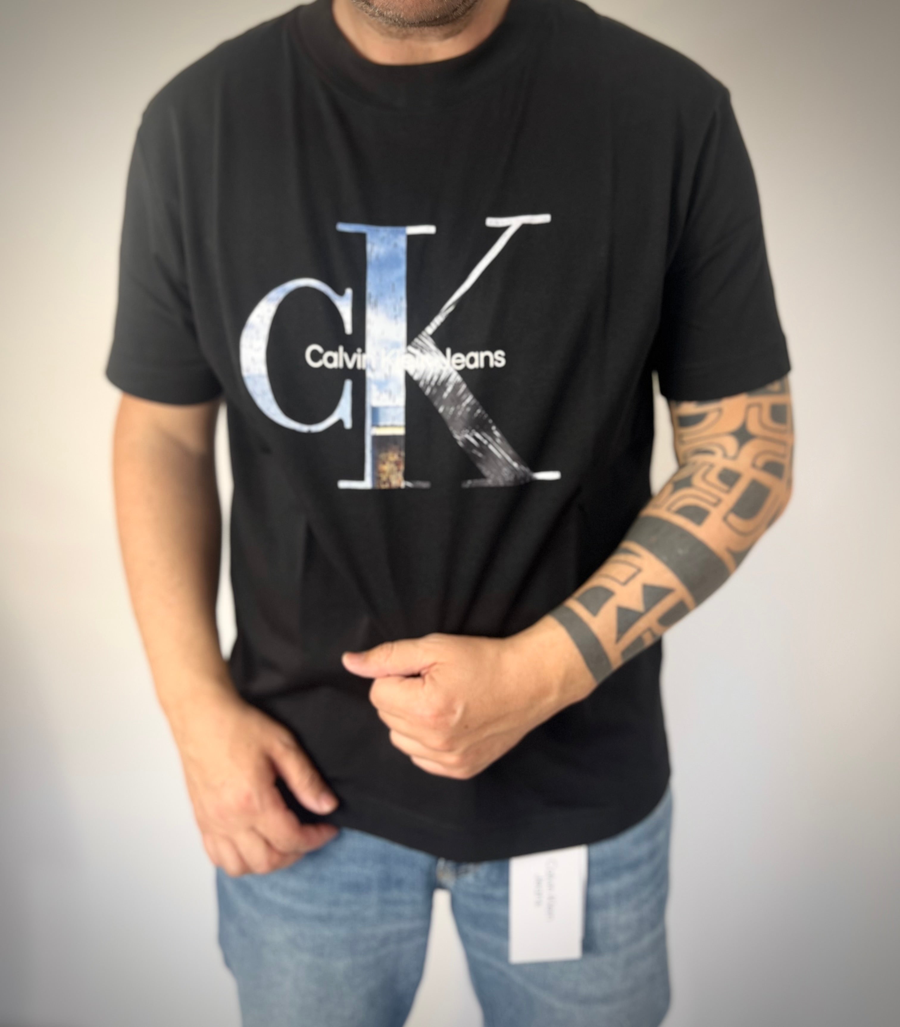 T-Shirt Calvin colore nero , stampa al petto con interno disegni Maldive alberi ecc , 100% cotone poco elastico , girocollo