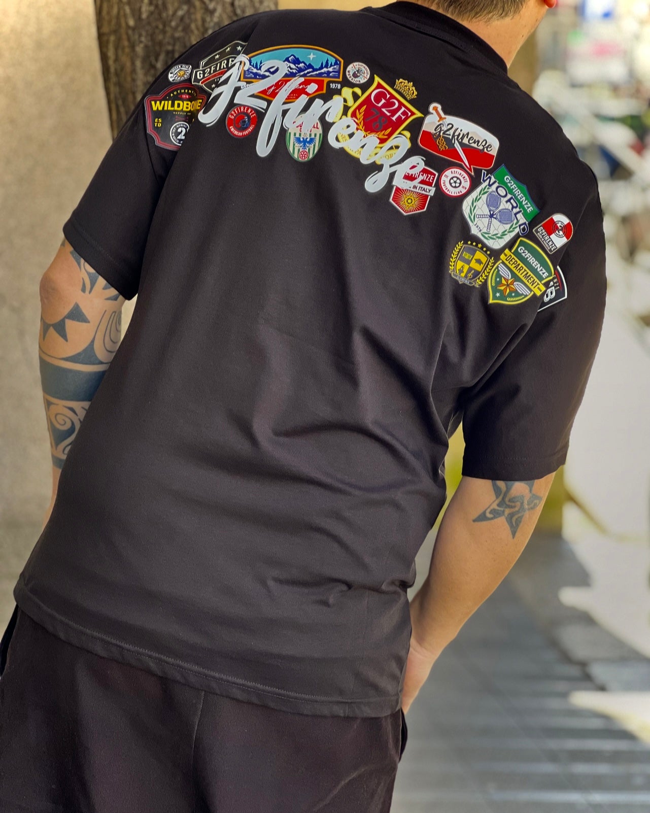 T-Shirt : colore nero , stampa g2 davanti , dietro fantasia , Vestibilita ‘ poco larga ,