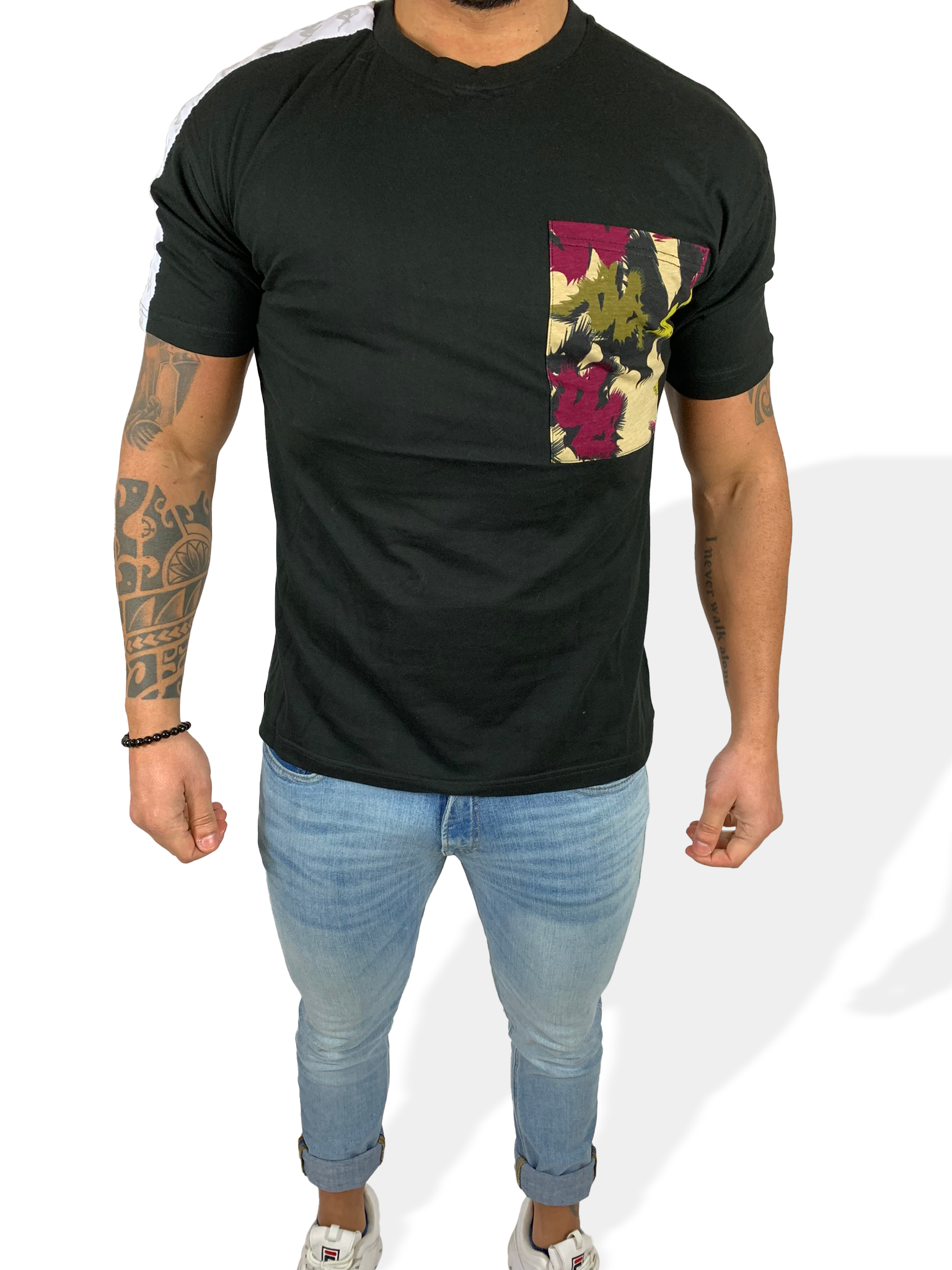 T-shirt Kappa con banda laterale bianca e fantasia militare frontale