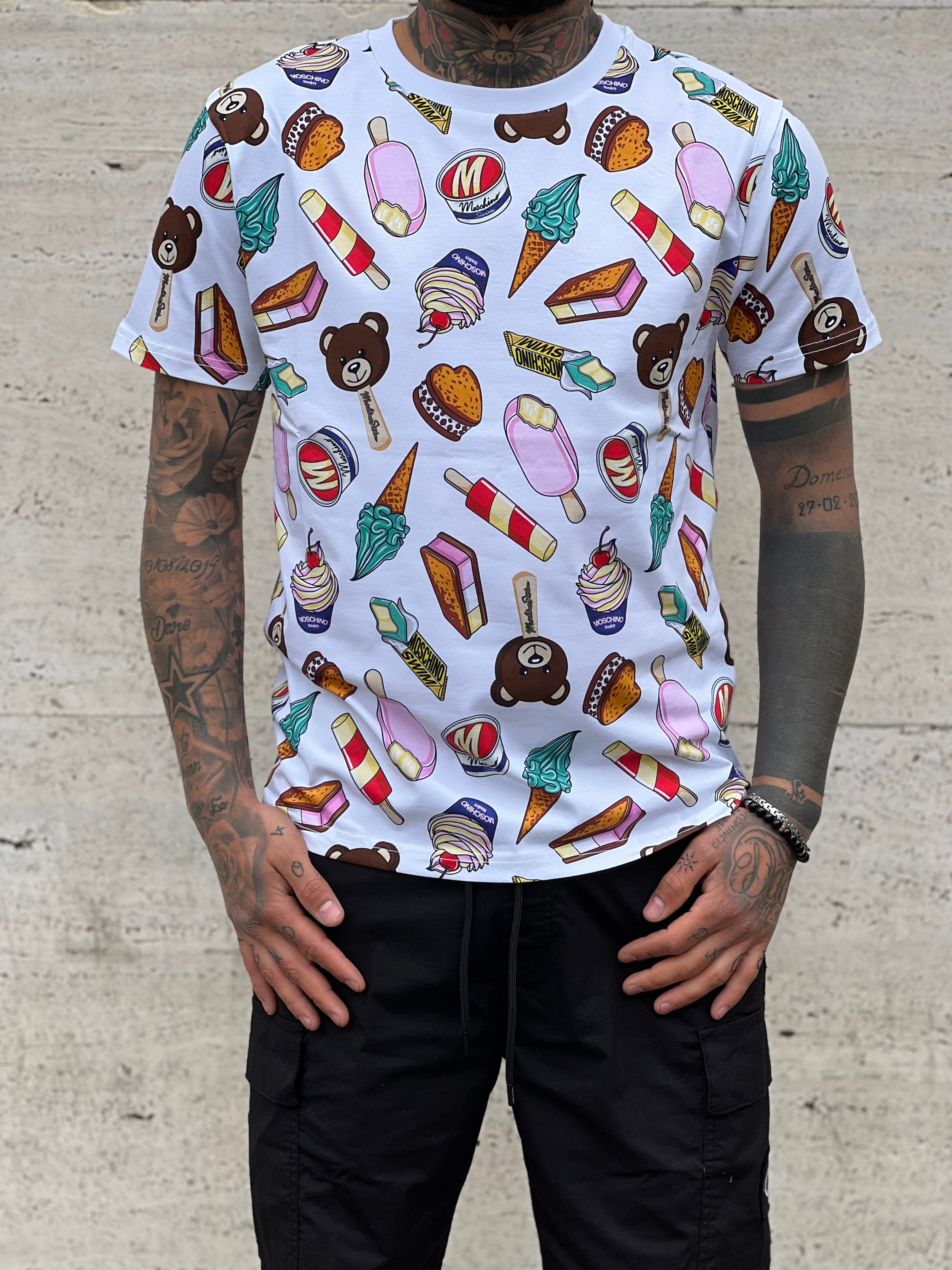 T-Shirt : colore bianca , fascia laterale ,scritta Moschino , Vestibilita ‘ normale