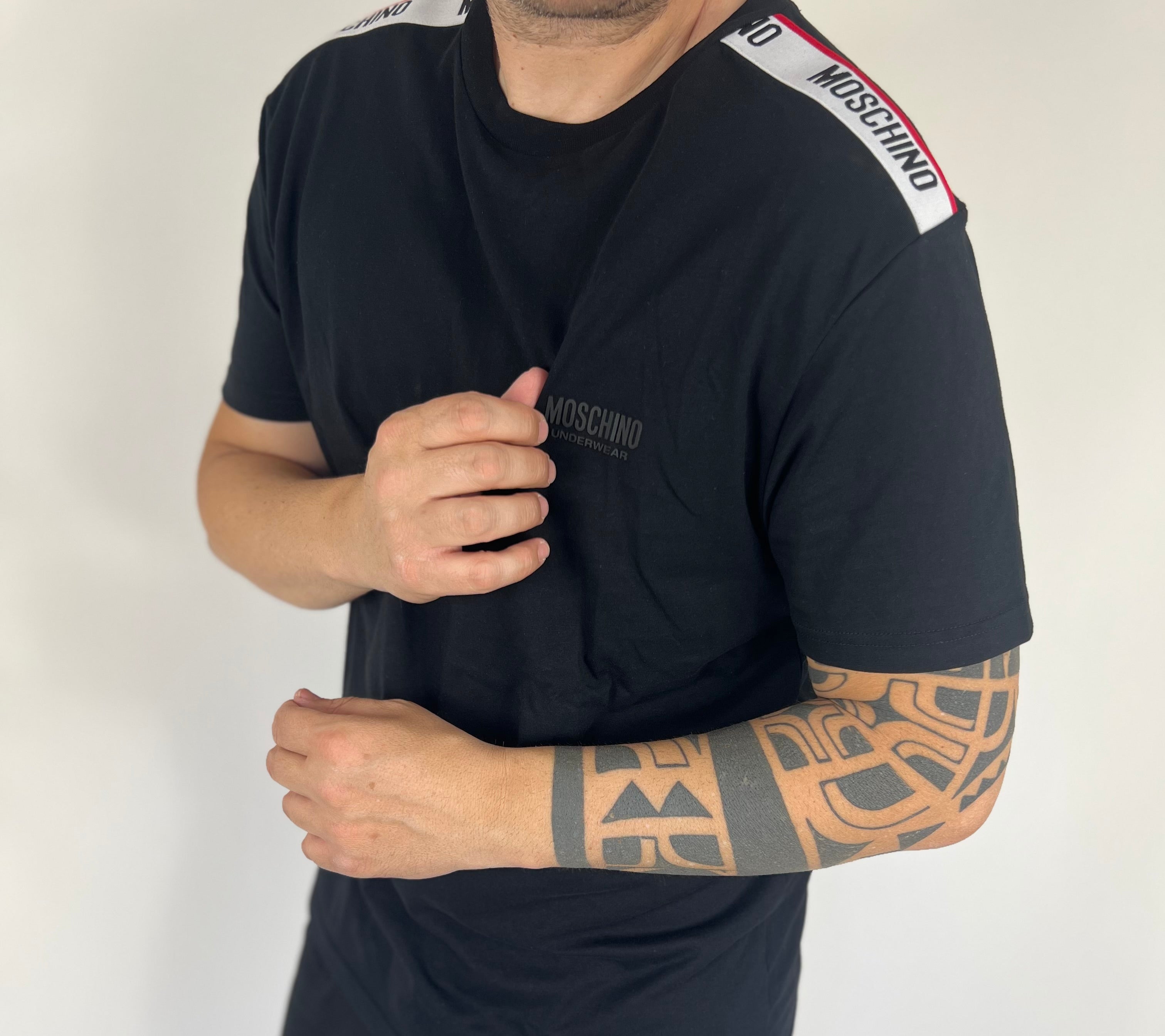 Maglia , 100% cotone , girocollo , Vestibilita ‘ poca elastica , stampa con tessuto sulle spalle , colore nero
