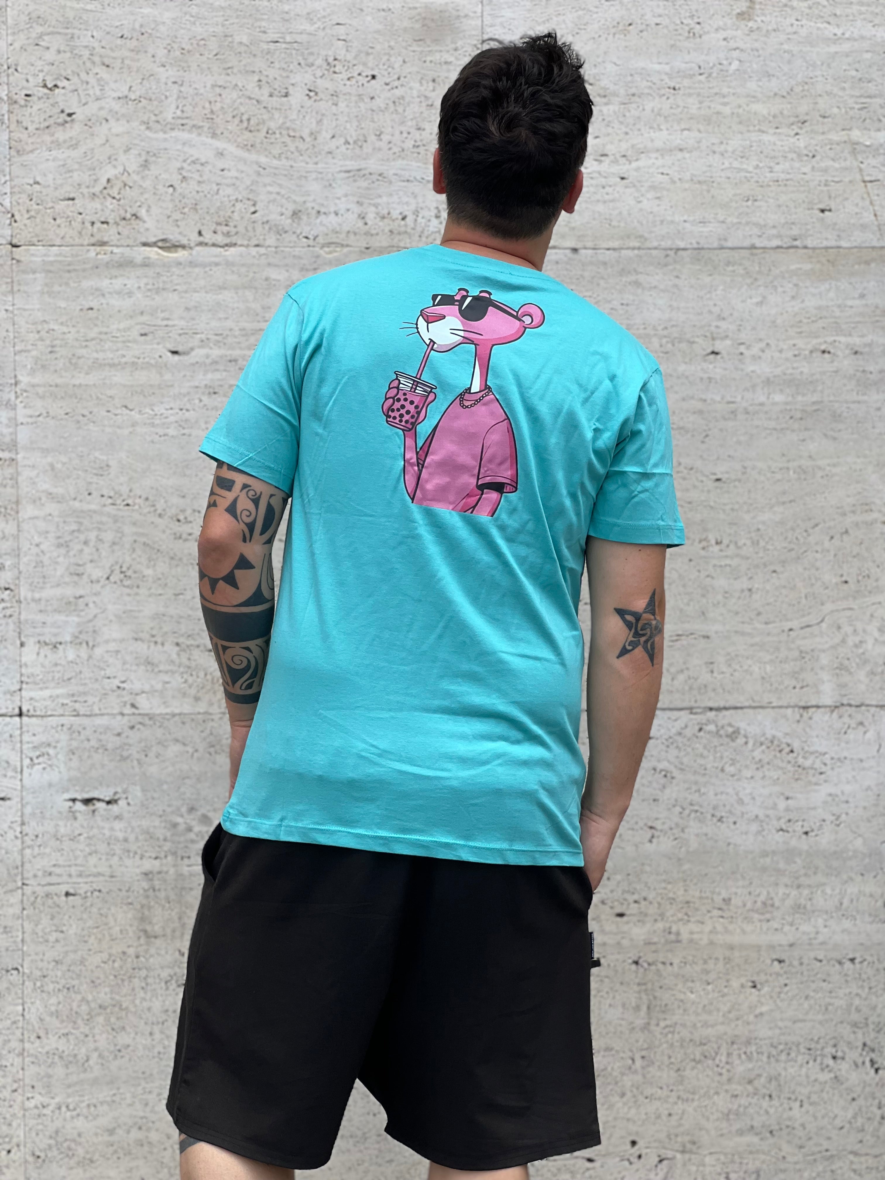 T-Shirt 100% cotone , colore tyffany , stampa sulla schiena , pantera rosa , girocollo Vestibilita’ normale
