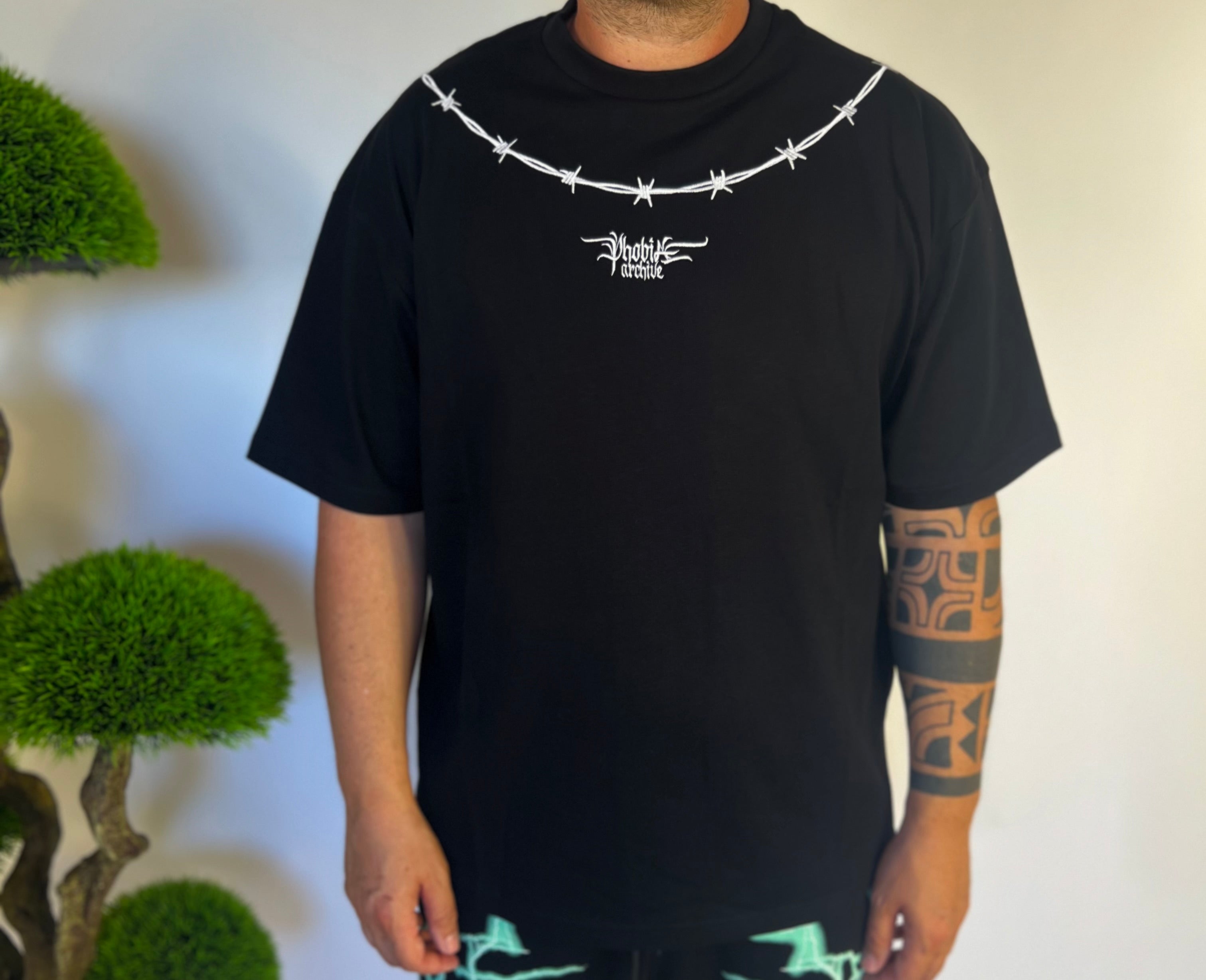 Maglia nera con filo spinato bianco , Vestibilita’ normale , girocollo ,100% cotone ,