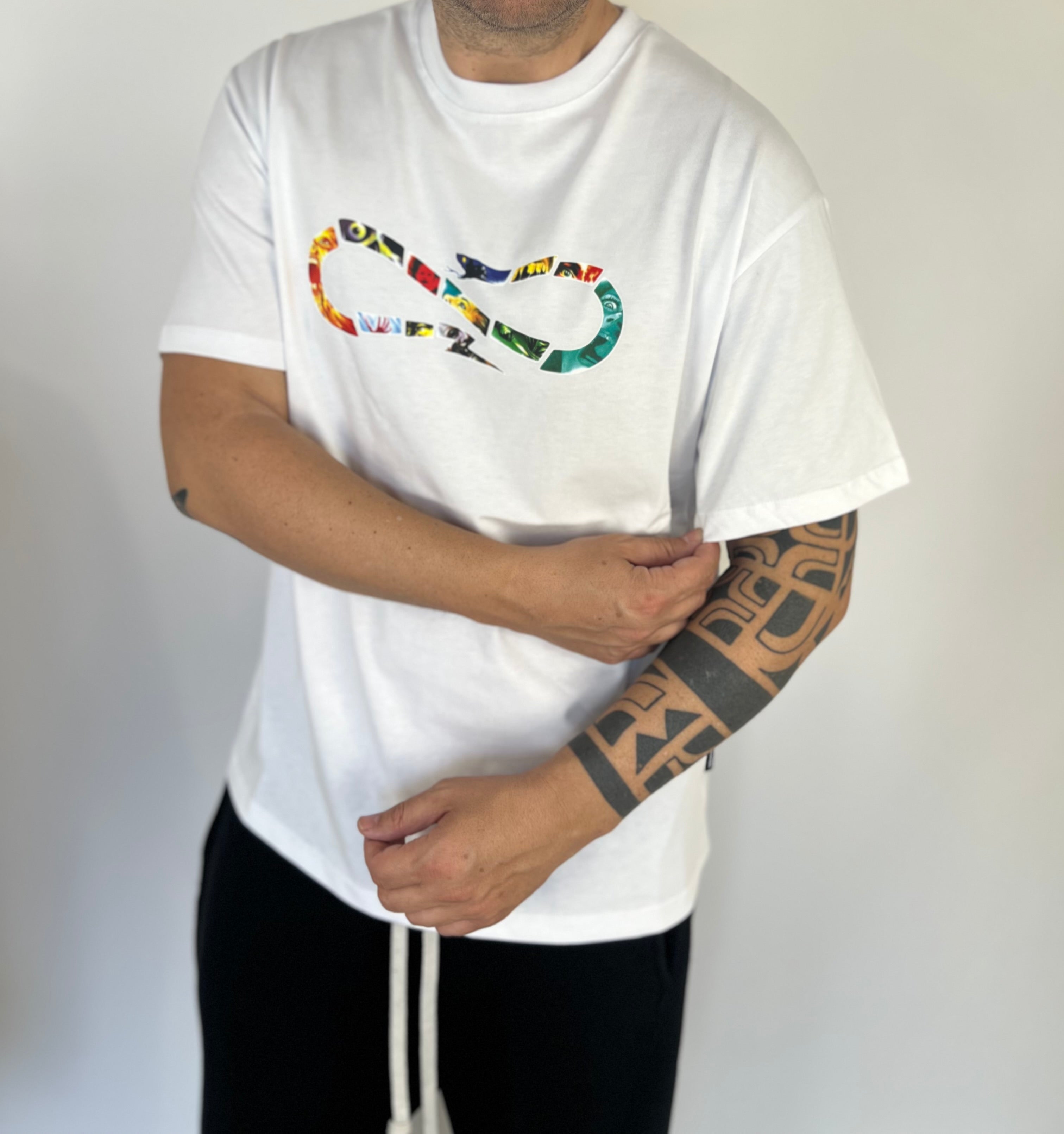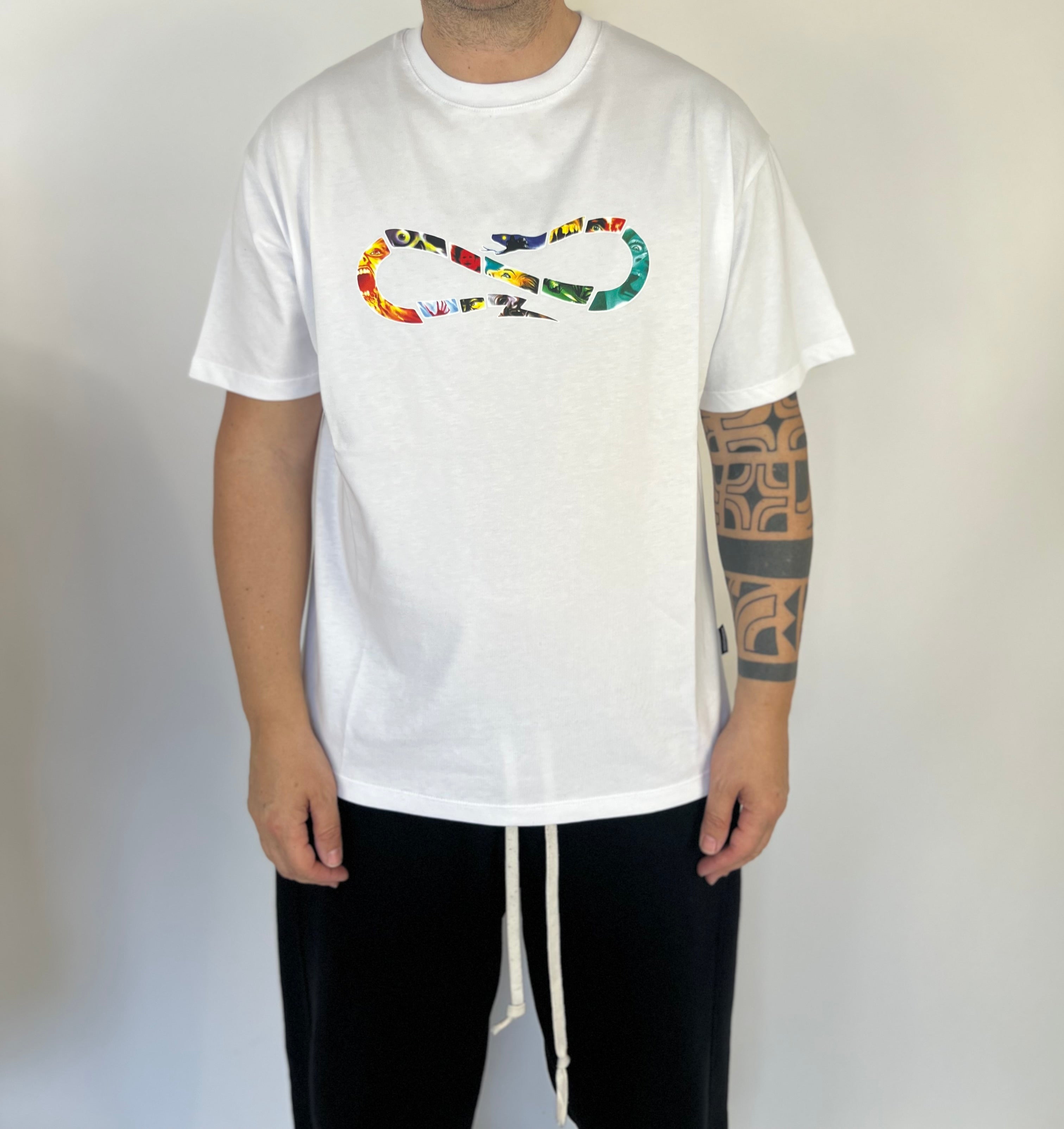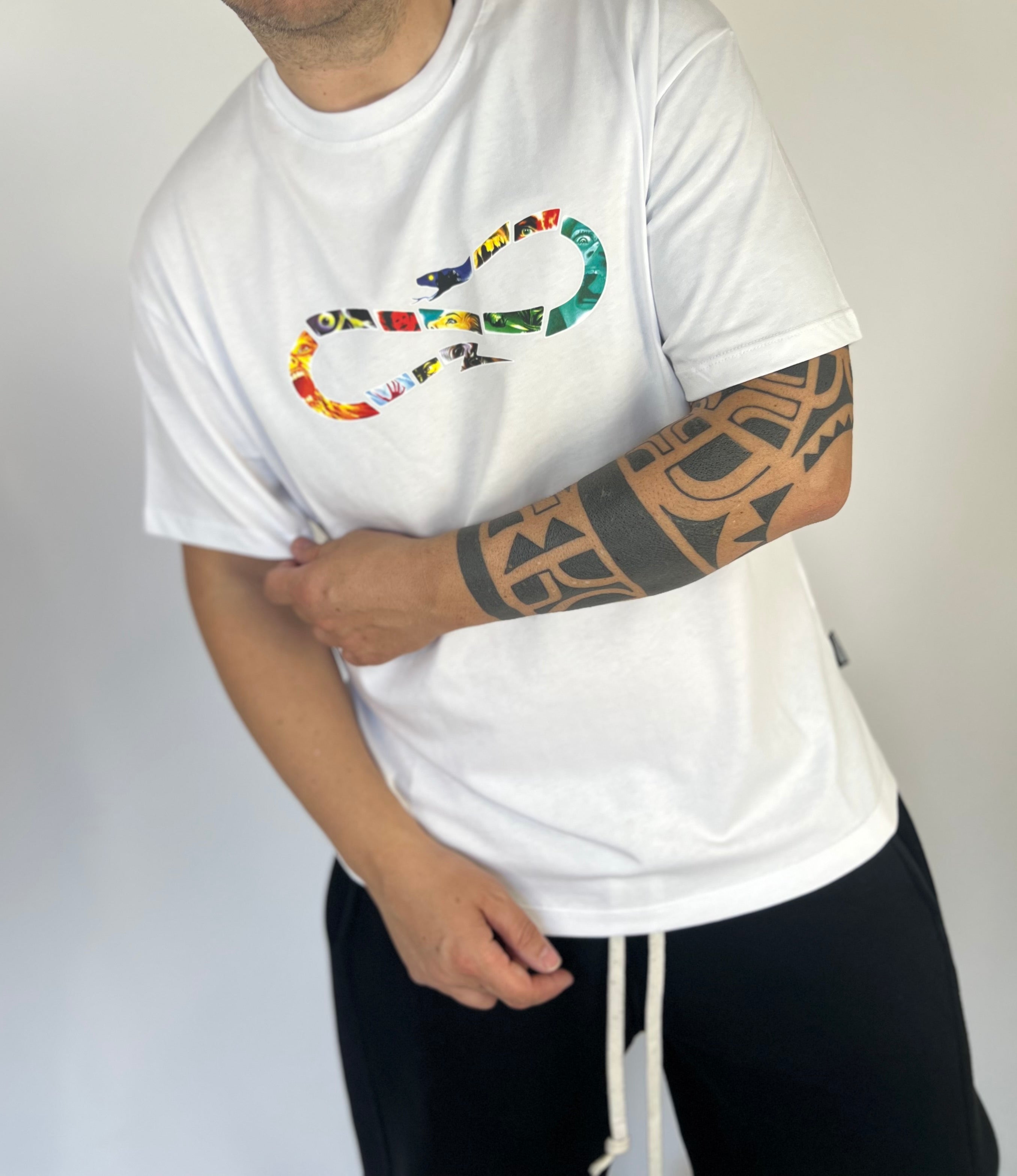 T-Shirt 100% cotone , colore bianca , serpente colorato , scritta dietro , Vestibilita ‘ normale